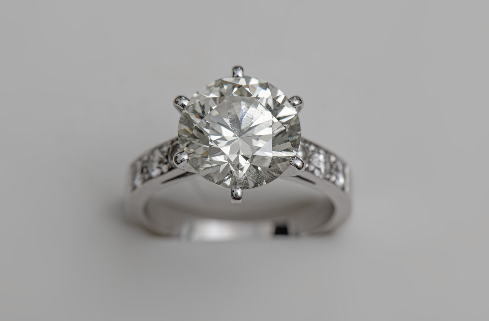 BAGUE en or gris 18K (750 millièmes) ornée d’un diamant de taille moderne, serti griffes, épaulé de six diamants calibrant 0,10 carat environ.