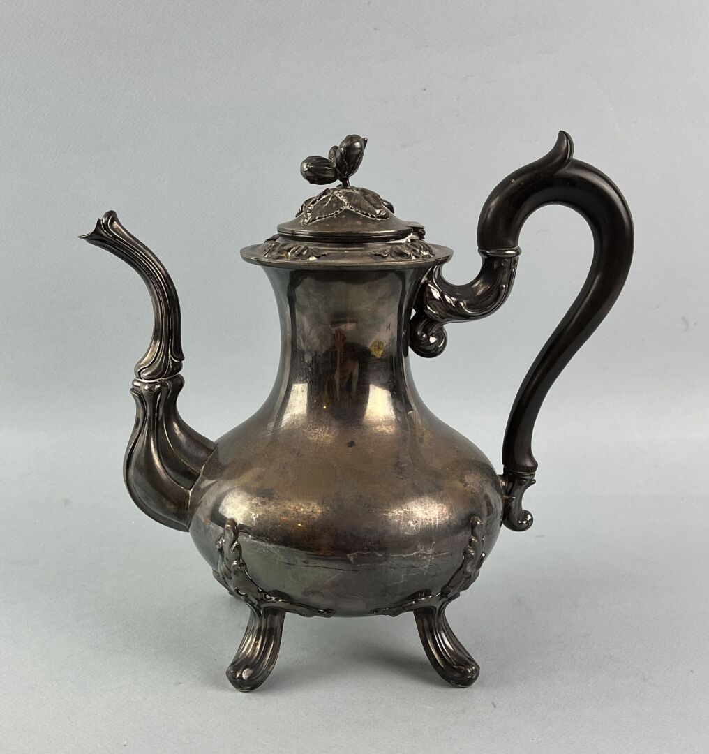 Cafetière en argent, poinçon Minerve, à décor de rinceaux, le frètel figurant des noisettes et feuilles de noisetier, reposant sur quatre pieds à décor de rinceaux de style Rocaille, manche en bois noirci