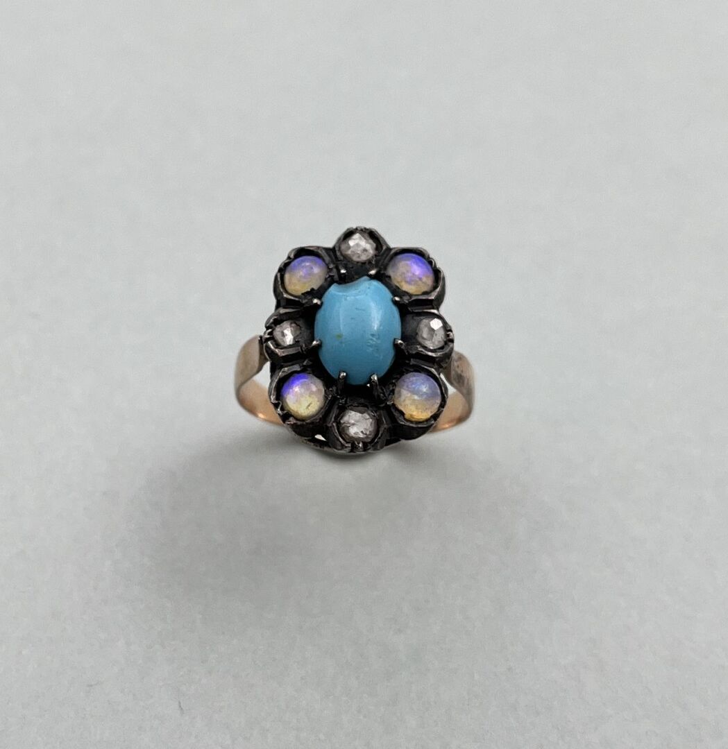 Bague en or rose (750 millièmes) et argent (800 millièmes) centrée d’un cabochon de turquoise entouré de quatre roses diamantées alternées de quatre pierres de lune taillées en cabochon