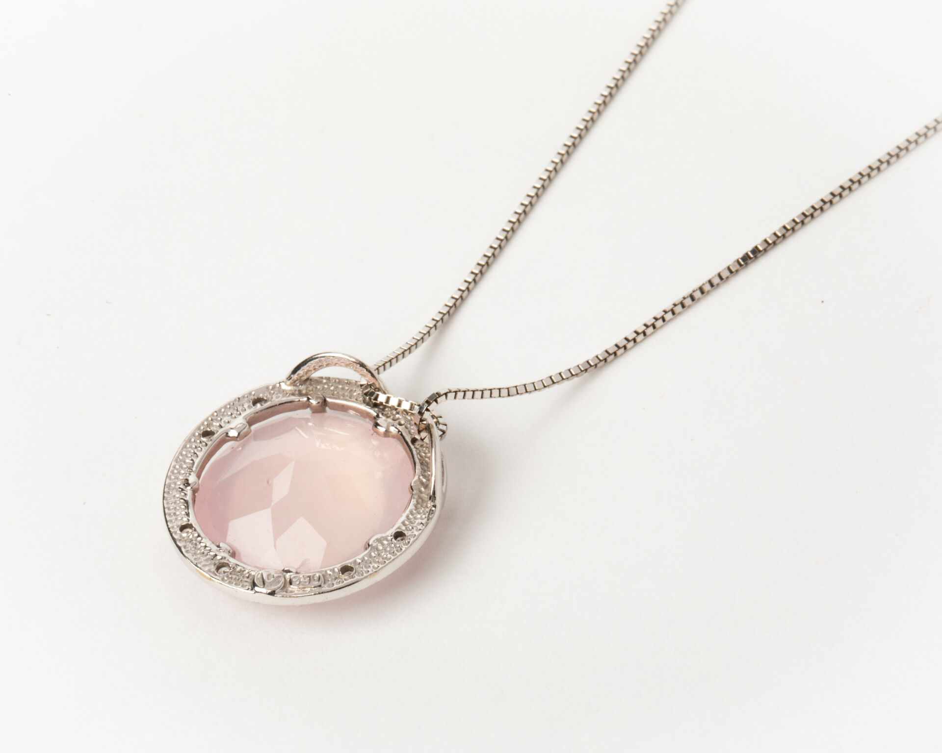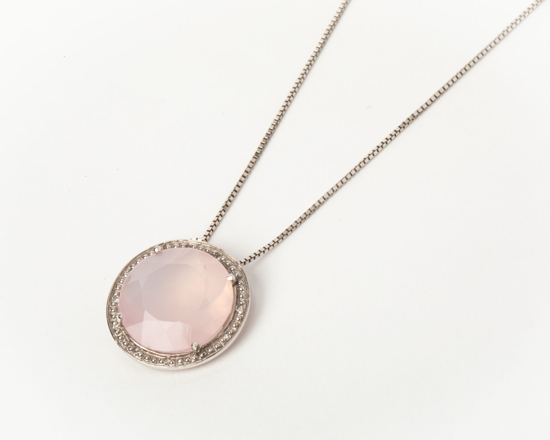 Parure en métal argenté comprenant un collier pendentif serti d’une pierre facettée en or rose et de deux boucles d’oreilles formant goutte