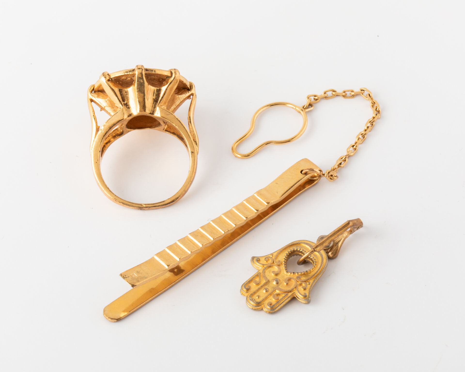 120 ESTIMATION: 20 / 30 € Ensemble de bijoux fantaisie comprenant une bague sertie griffe d’une imitation de pièce d’or, une pince à cravate et une dormeuse figurant la main de Fatma