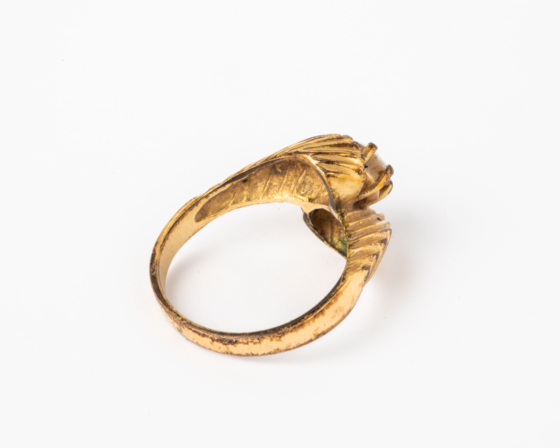123 ESTIMATION: 5 / 10 € Bague en métal doré à décor de feuilles stylisées sertie d’un strass TDD : 57 Sauts de matière