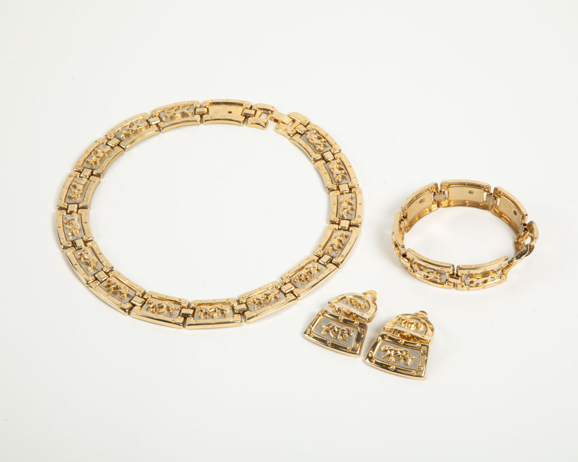 126 ESTIMATION: 30 / 50 € Parure en métal doré à décor de panthères comprenant un collier, un bracelet et deux clips d’oreilles