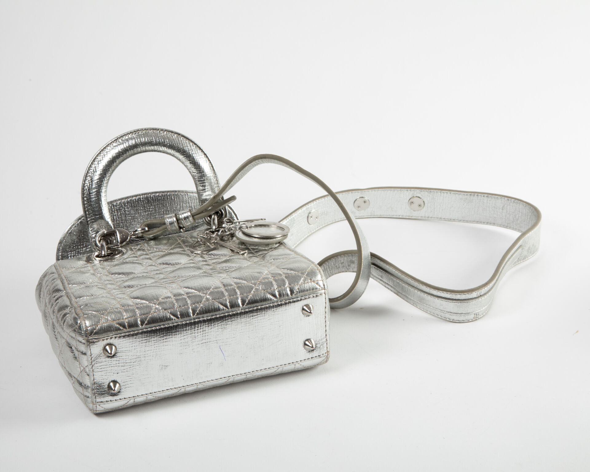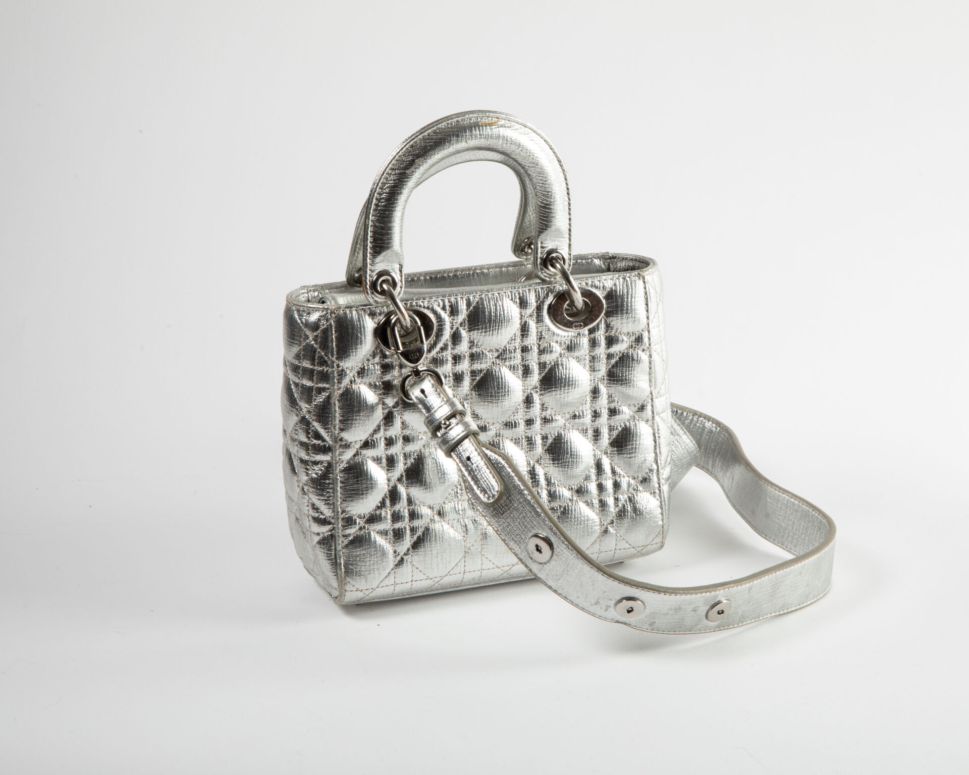 Sac Lady Dior en cuir matelassé argenté à deux anses et une bandoulière