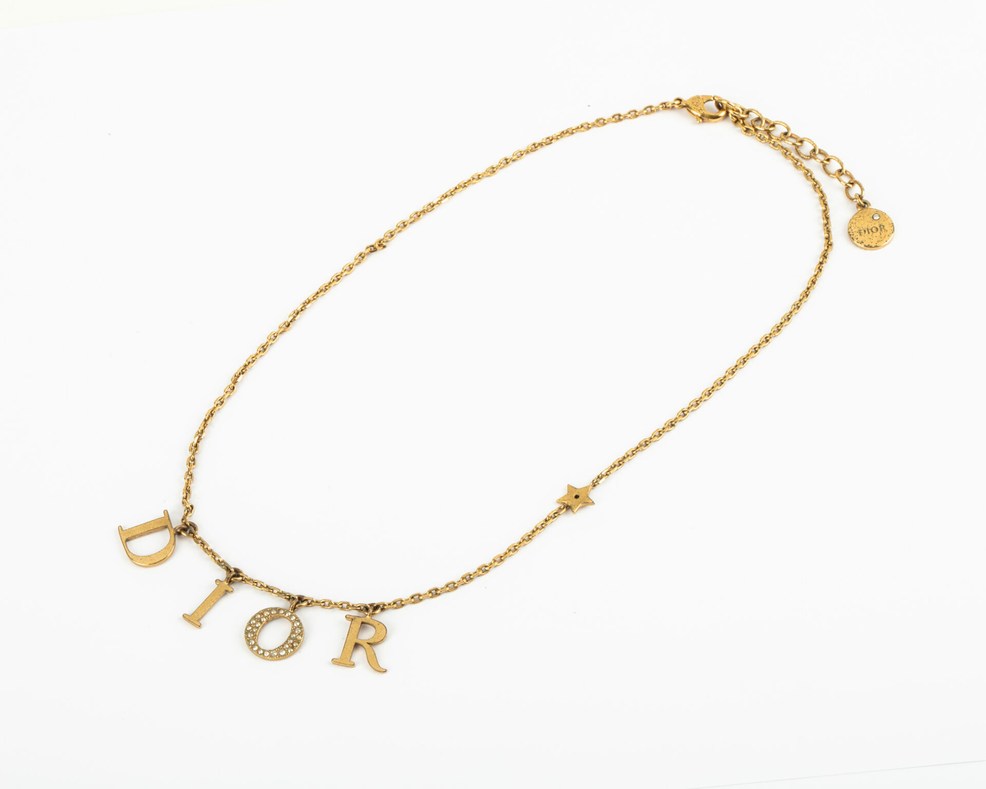 173 ESTIMATION: 10 / 20 € Christian DIOR, Paris Collier en métal doré à décor de lettres au nom de la marque, le O pavé de strass Etat d’usage