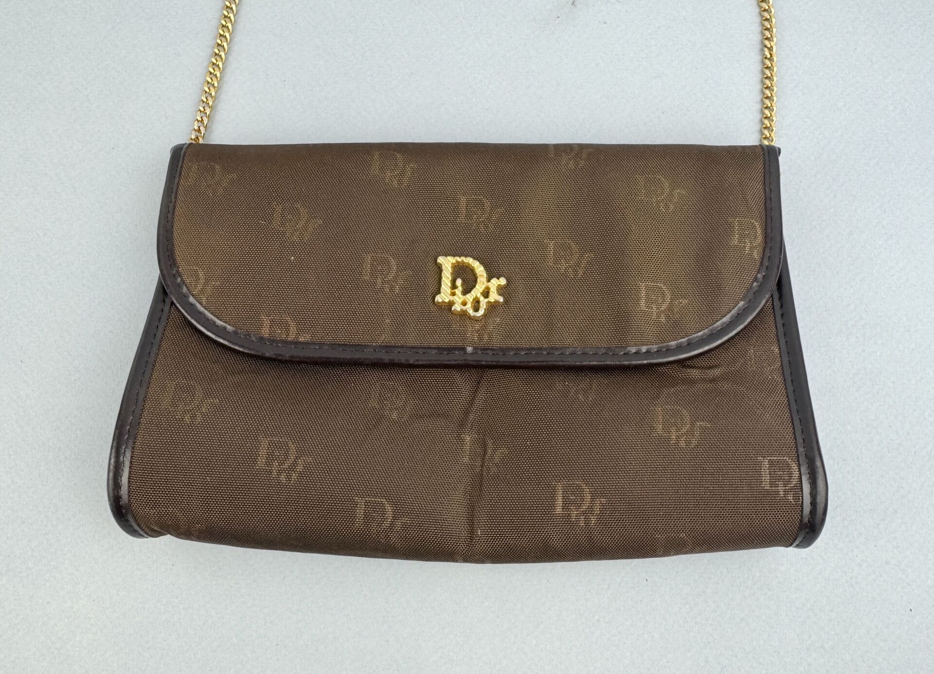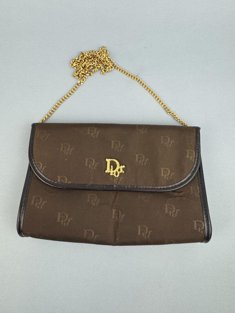 174 ESTIMATION: 40 / 60 € CHRISTIAN DIOR Sac à bandoulière en toile brune au logo de la marque et cuir marron, accastillage en métal doré, bandoulière en chaine dorée Défauts de collage de la toile H : 12.5 – L : 19 cm