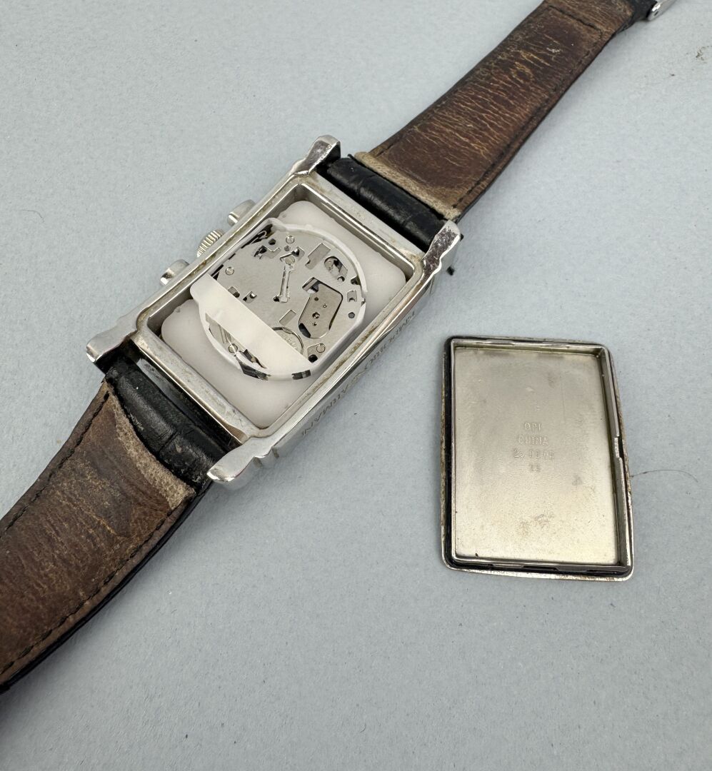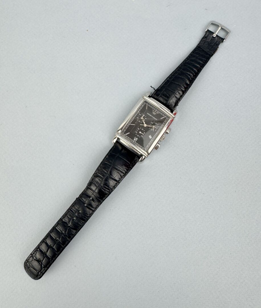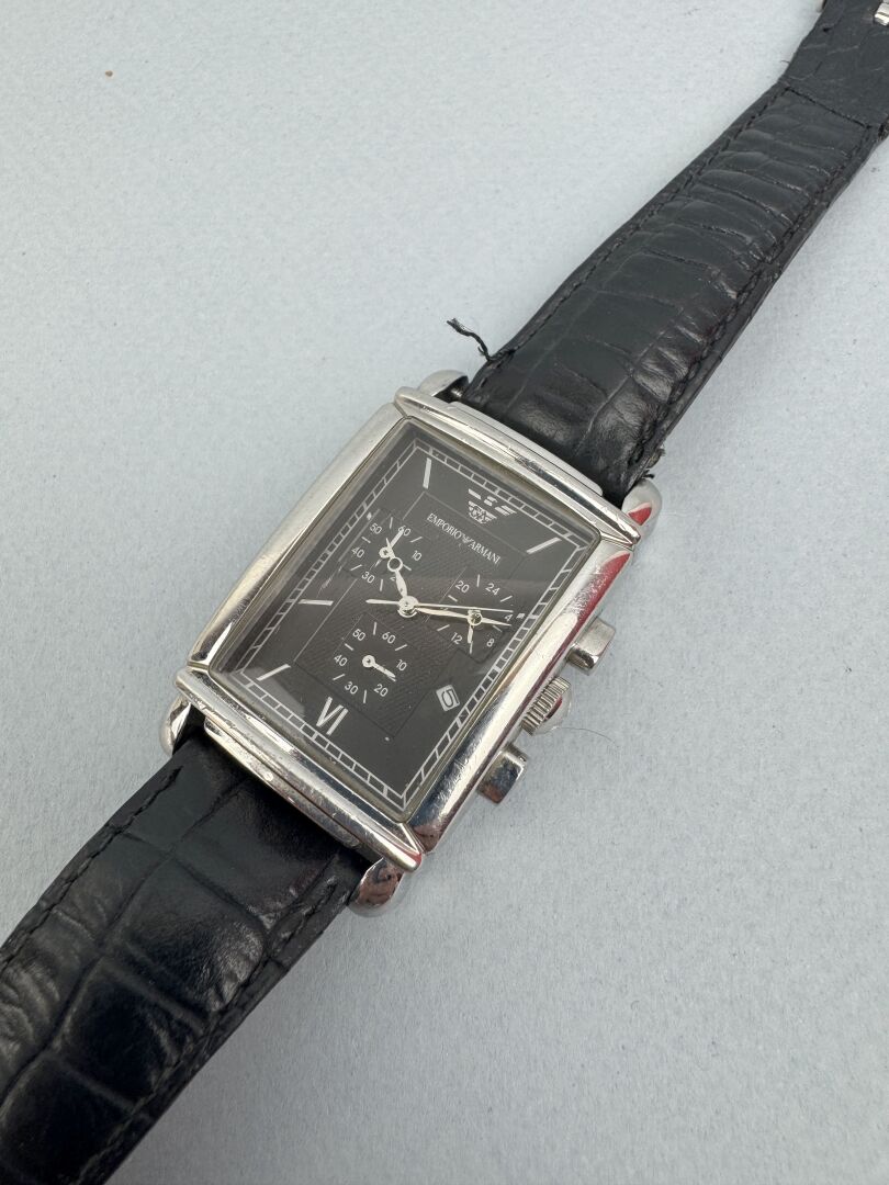 181 ESTIMATION: 10 / 20 € EMPORIO ARMANI Montre d’homme en acier, cadran à fond noir à trois cadrans, index bâton pour les heures, dateur à quatre heures, bracelet en cuir façon croco Bracelet usé, arrière du boitier à refixer