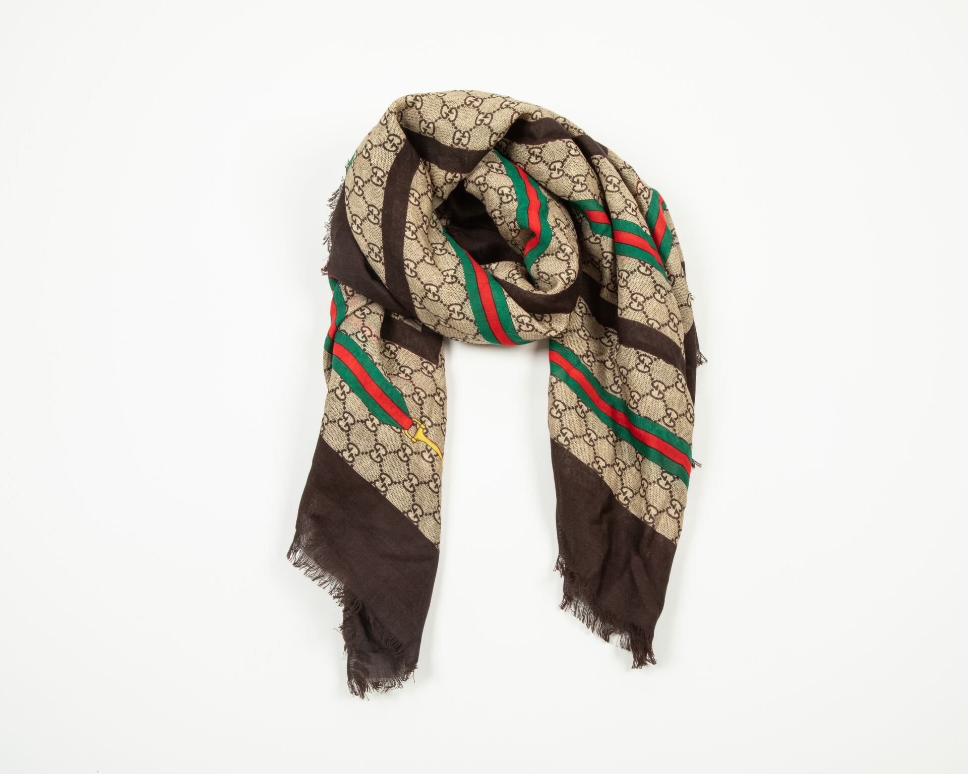 Foulard en soie au logo de la marque et à décor de lanières et mors