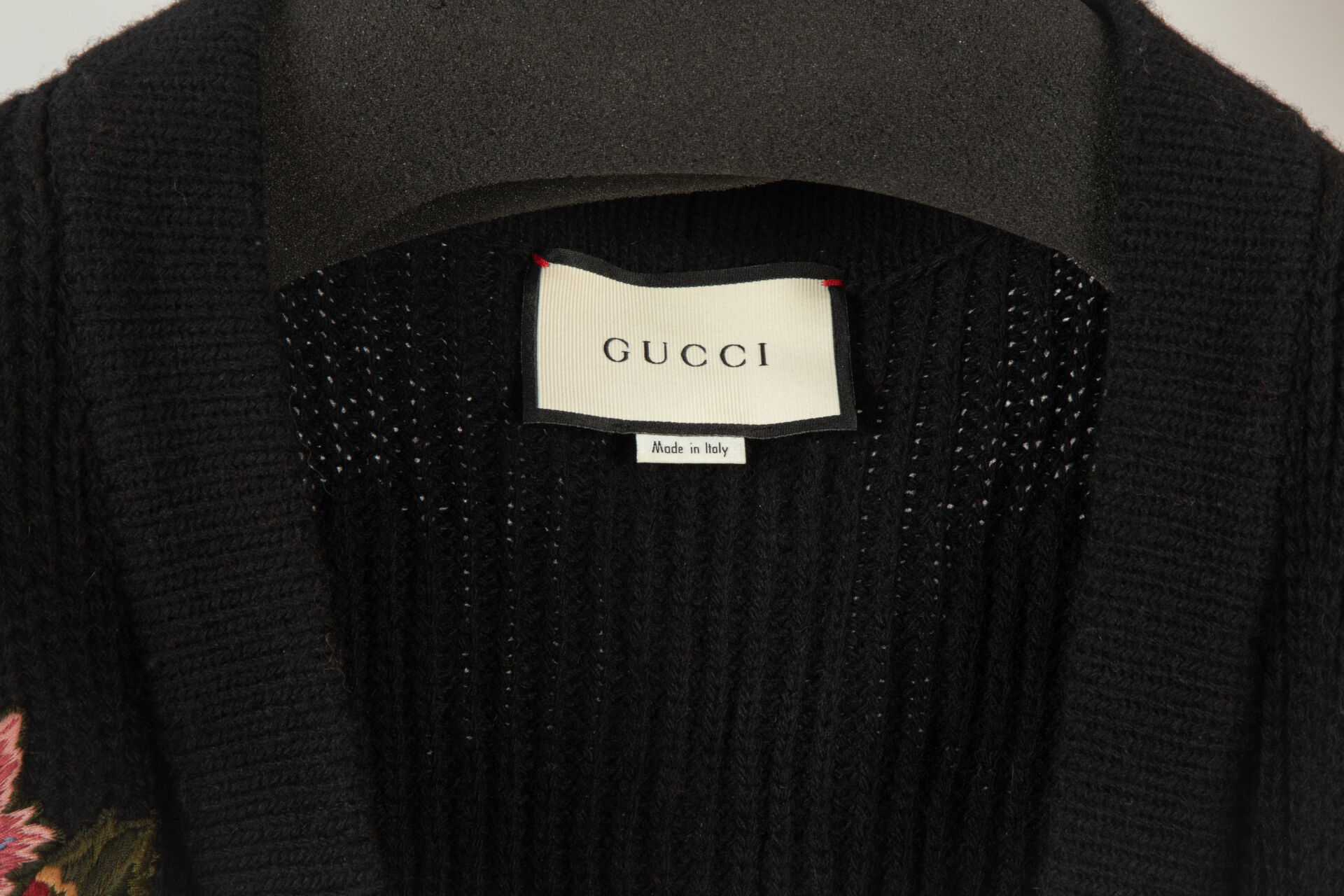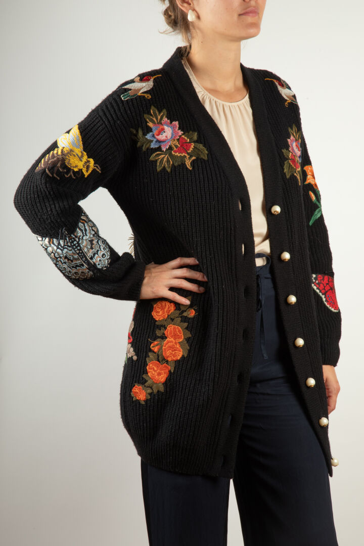 Modèle L’aveugle par amour – Cardigan en laine tricotée à décor de broderies appliquées, fermeture à sept boutons à décor de perles siglées Gucci