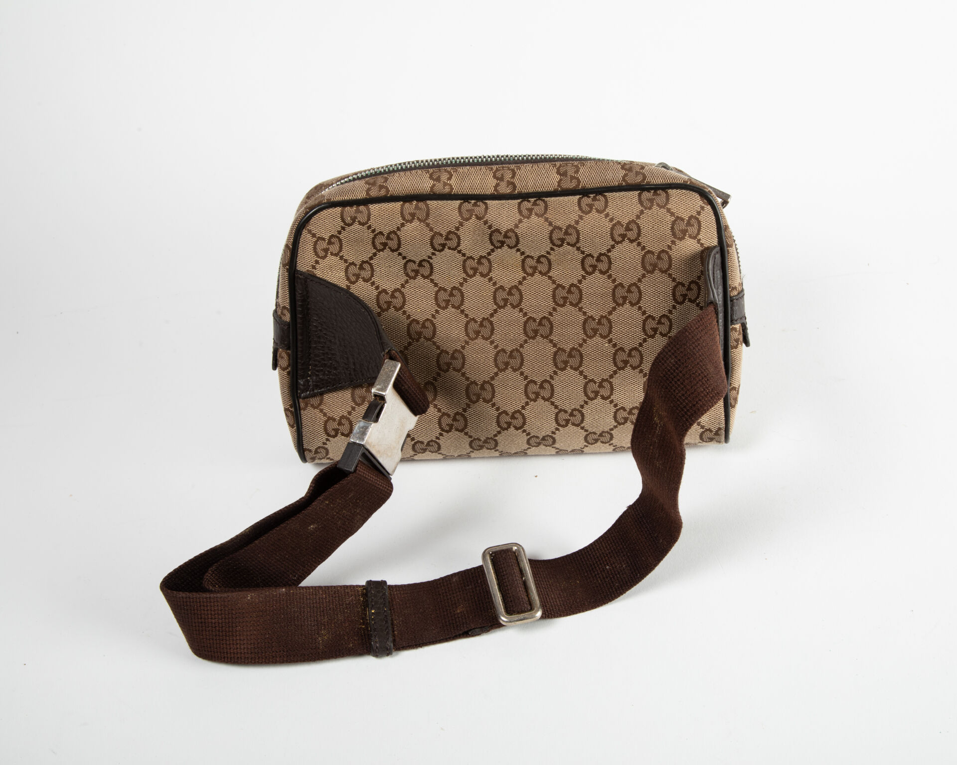 Modèle Pre Owned, sac banane en toile GG suprême et cuir marron, accastillage en métal argenté, intérieur en tissus marron à une poche appliquée, lanière en tissus réglable.