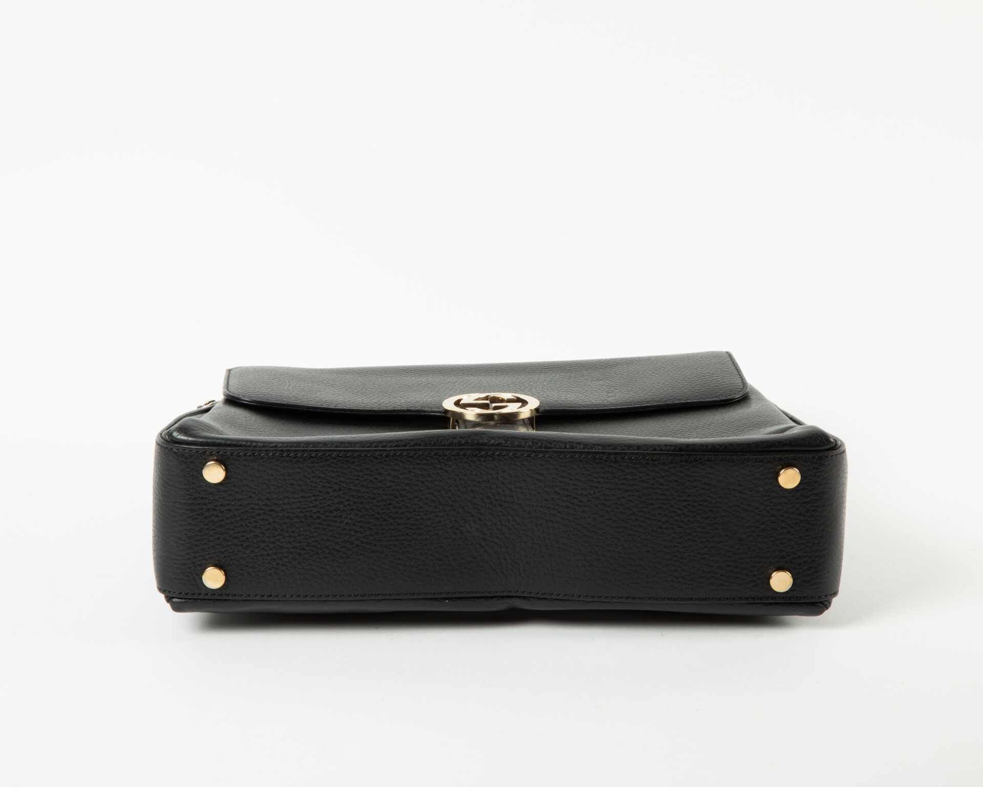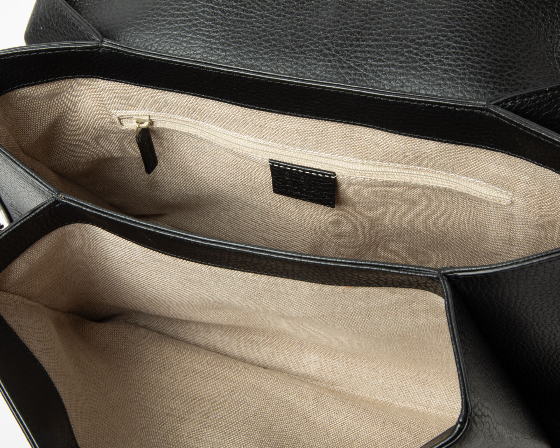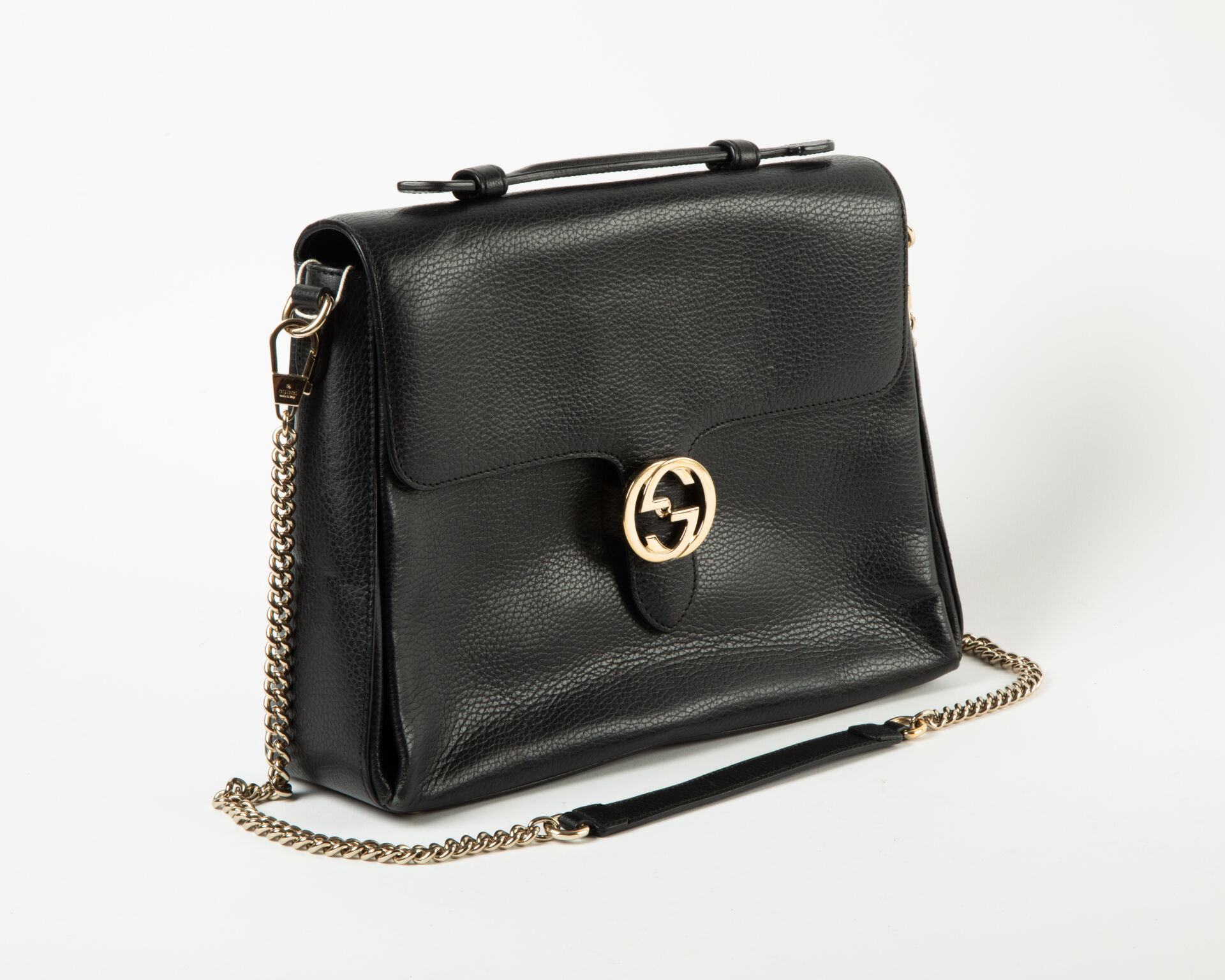 Sac à main en cuir grainé noir à une anse et à une lanière en chaine et cuir amovible, accastillage en métal doré, intérieur à deux compartiments en tissus beige à deux poches appliquées et une poche appliquée zippée