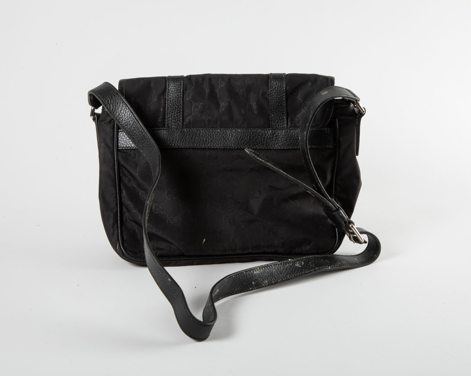 Sacoche à bandoulière en nylon gg suprême et cuir noir, accastillage en métal palladié, ouverture à rabat aimantée découvrant une poche plaquée zippée et un compartiment à trois poches appliquées dont une zippée