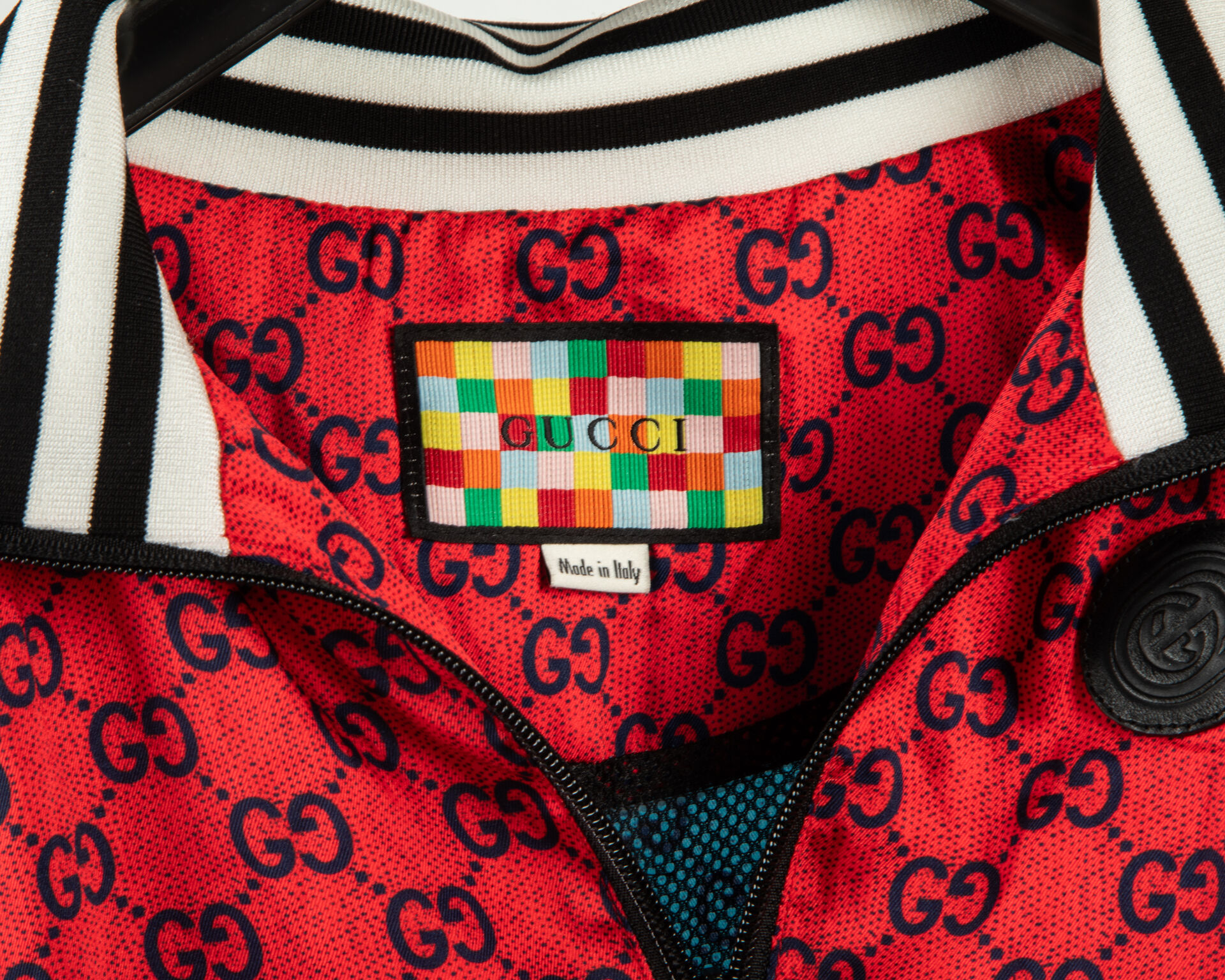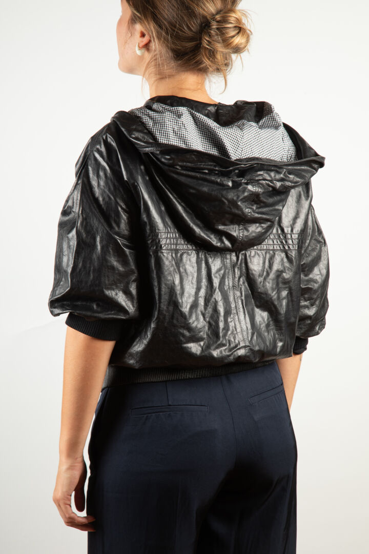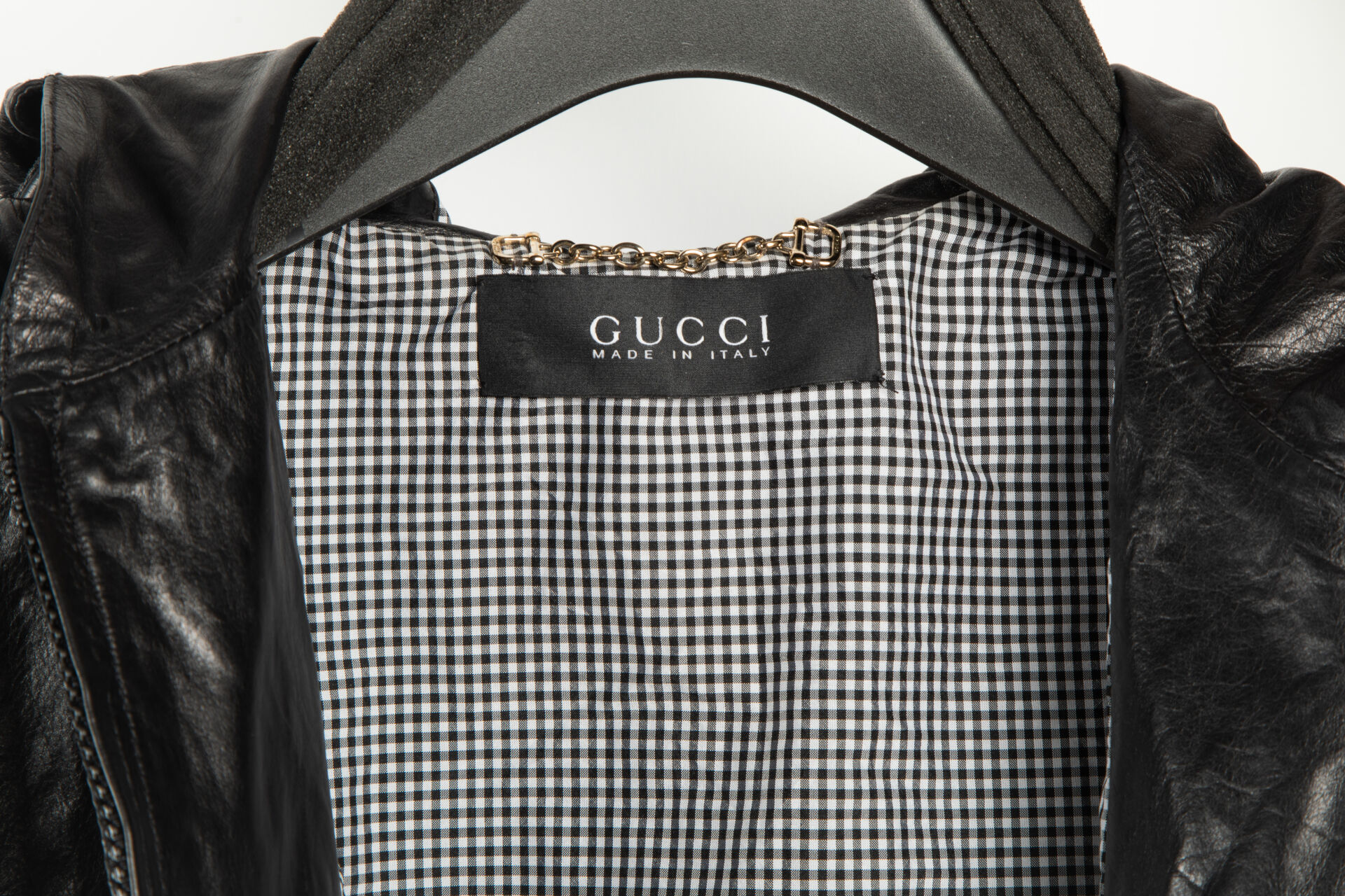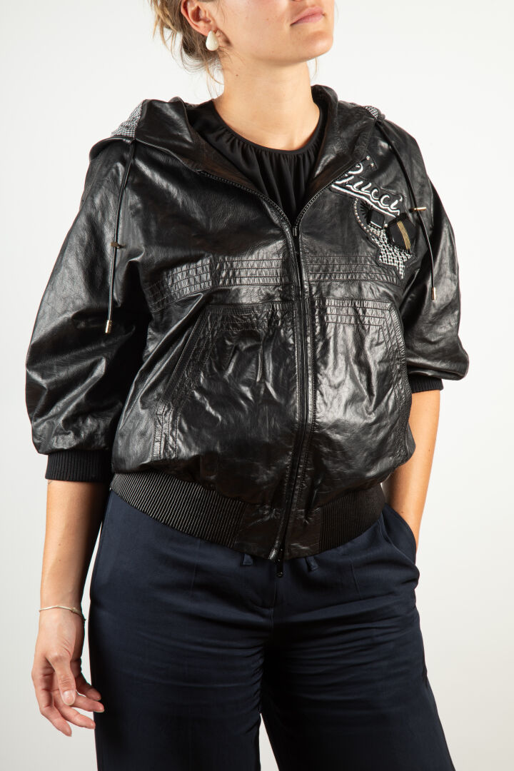 – Veste en cuir noir à capuche, fermeture zippée, logo Gucci brodé avec cabochons et strass sur la poitrine – Taille 42