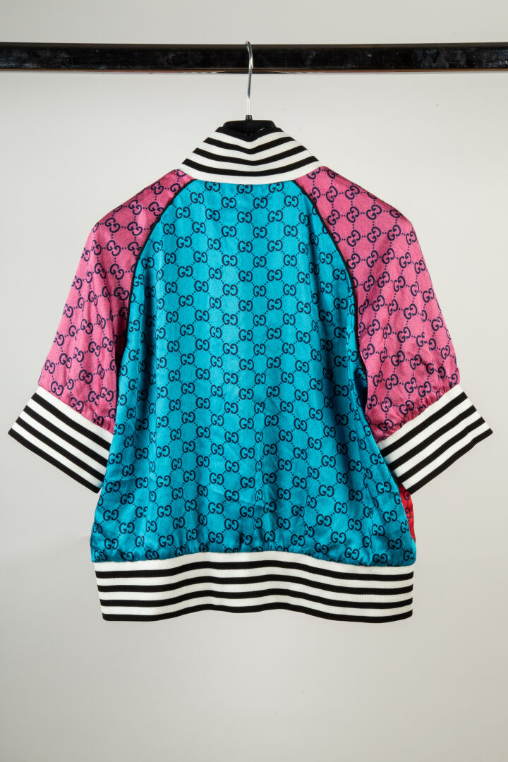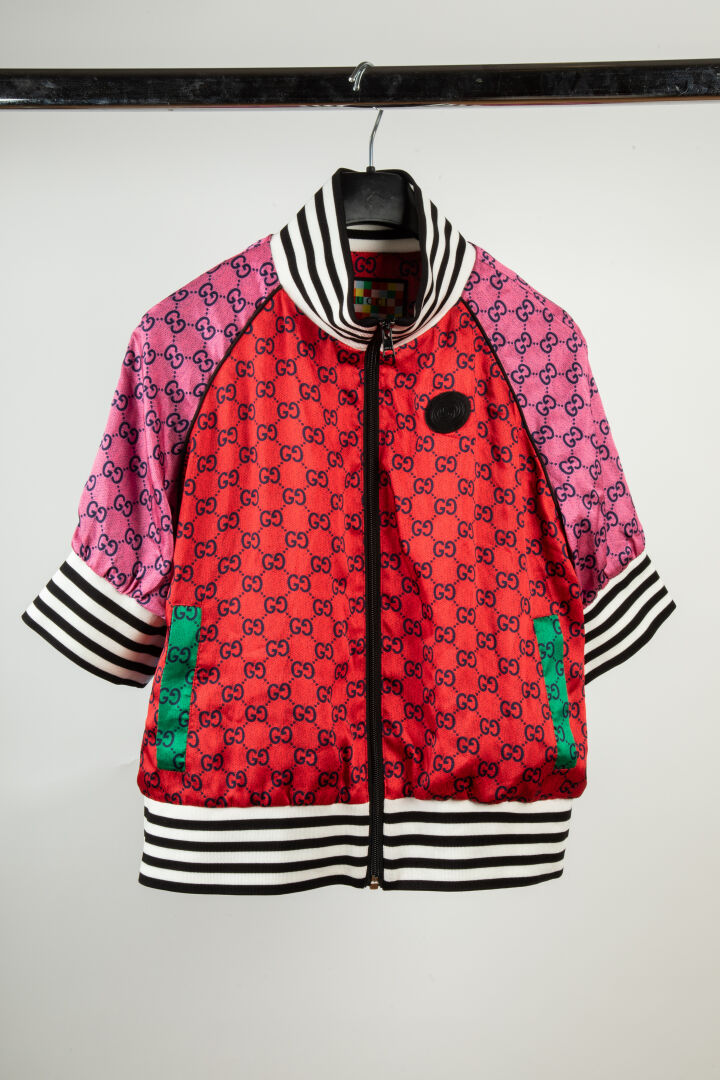 – Une veste légère à manches courtes en polyester multicolore au logo de la marque et rayures blanches et noires à deux poches plaquées, fermeture zippée – Taille 48 Italie