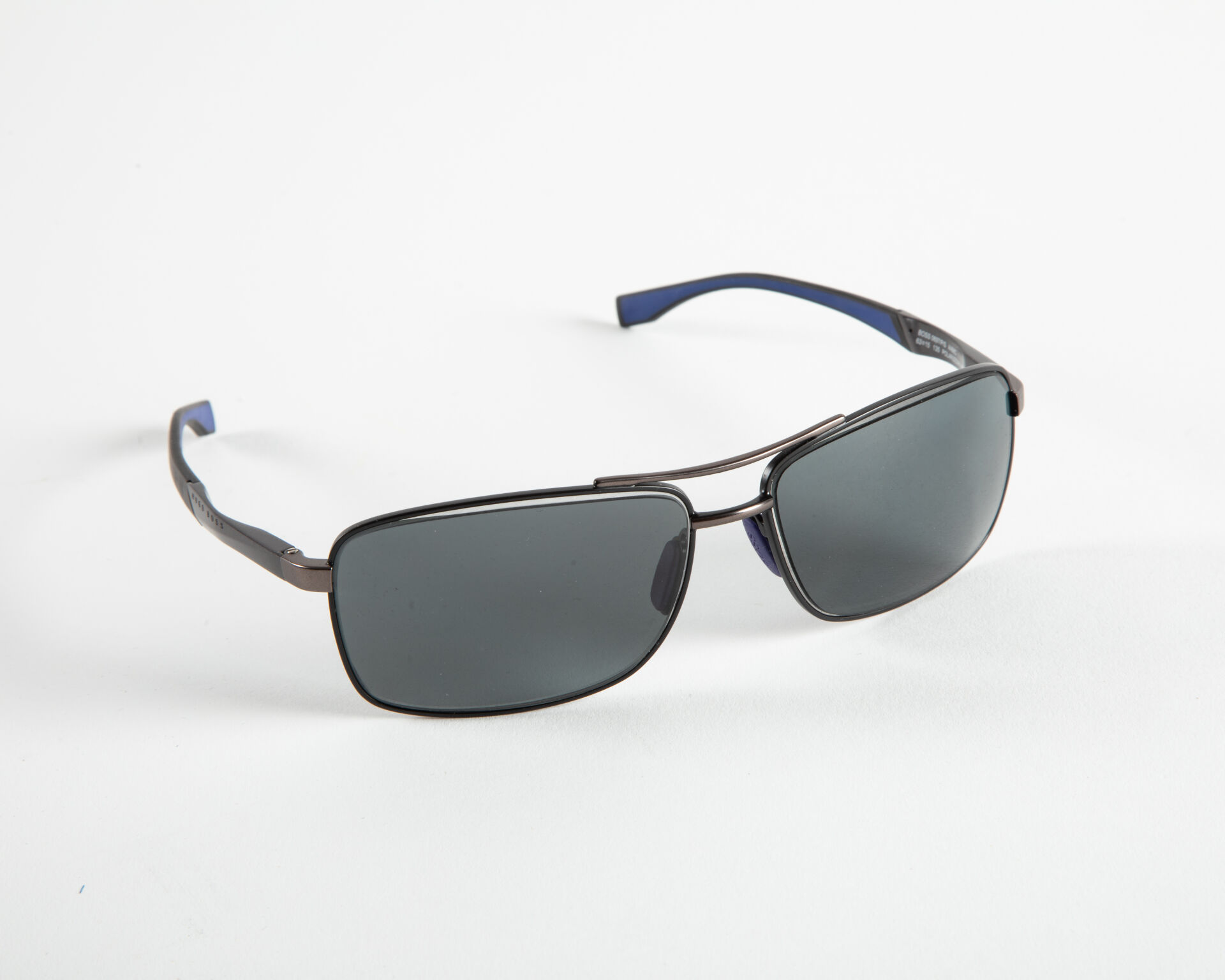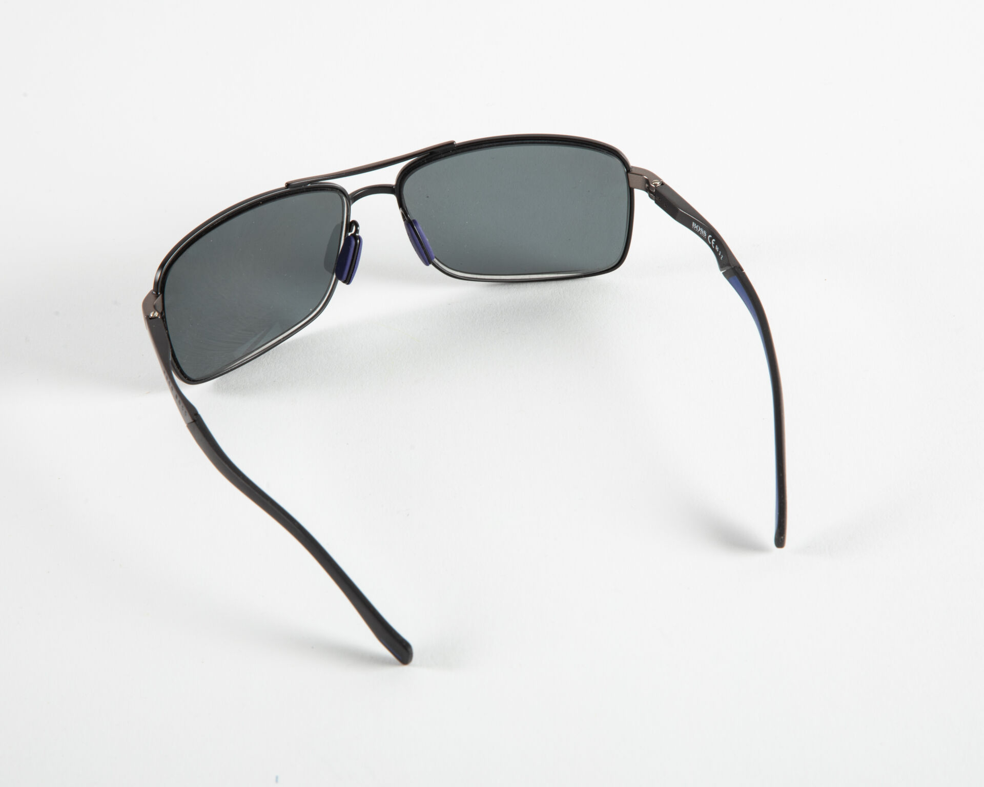 198 ESTIMATION: 20 / 30 € HUGO BOSS Paire de lunettes de soleil homme, verres fumés et monture en métal noir Dans un écrin de la marque