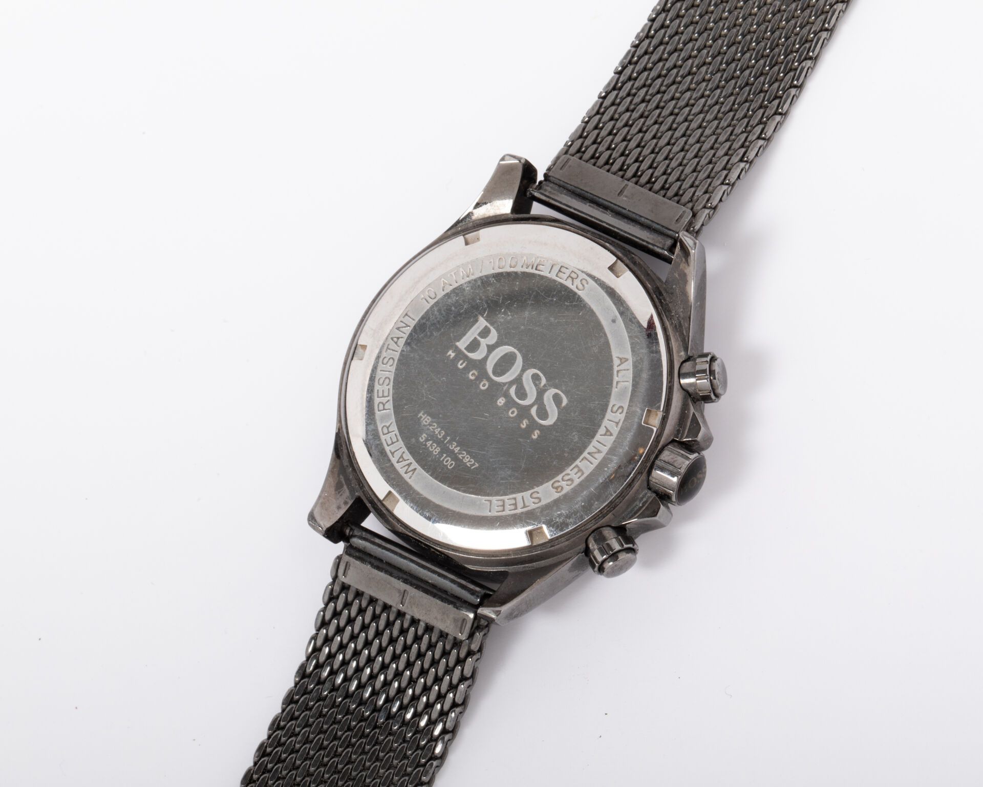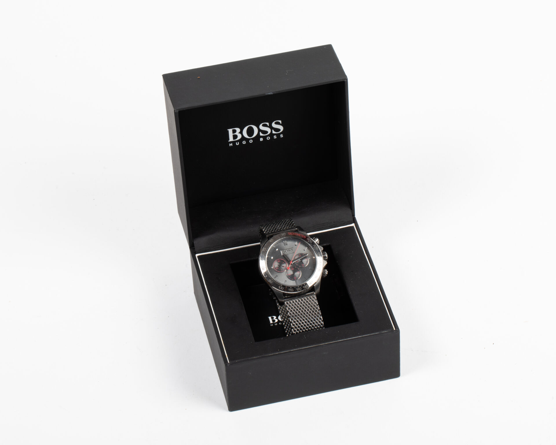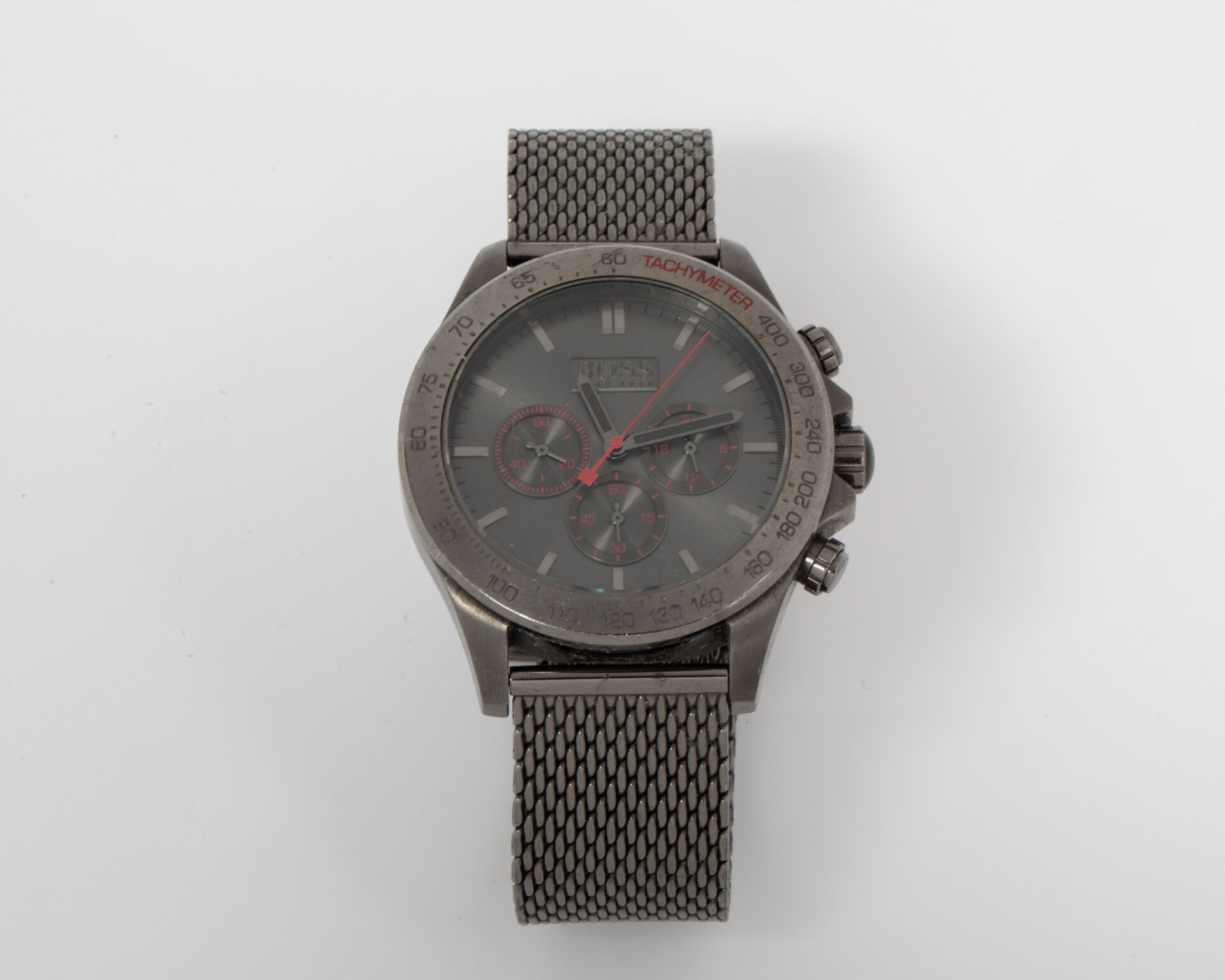 Montre bracelet d’homme chronographe en acier gris anthracite, cadran à fond gris anthracite rehaussé de rouge à trois sous cadrans, à index bâton pour les heures, mouvement à quartz, bracelet en acier gris anthracite.