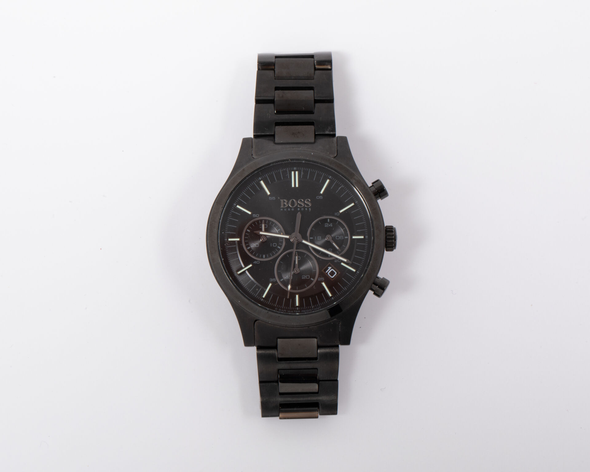 Montre bracelet d’homme chronographe en acier noir, cadran à fond noir à trois sous cadrans, index bâtons pour les heures, dateur entre 4h et 5h, mouvement quartz, vracelet en acier noir articulé à boucle déployante