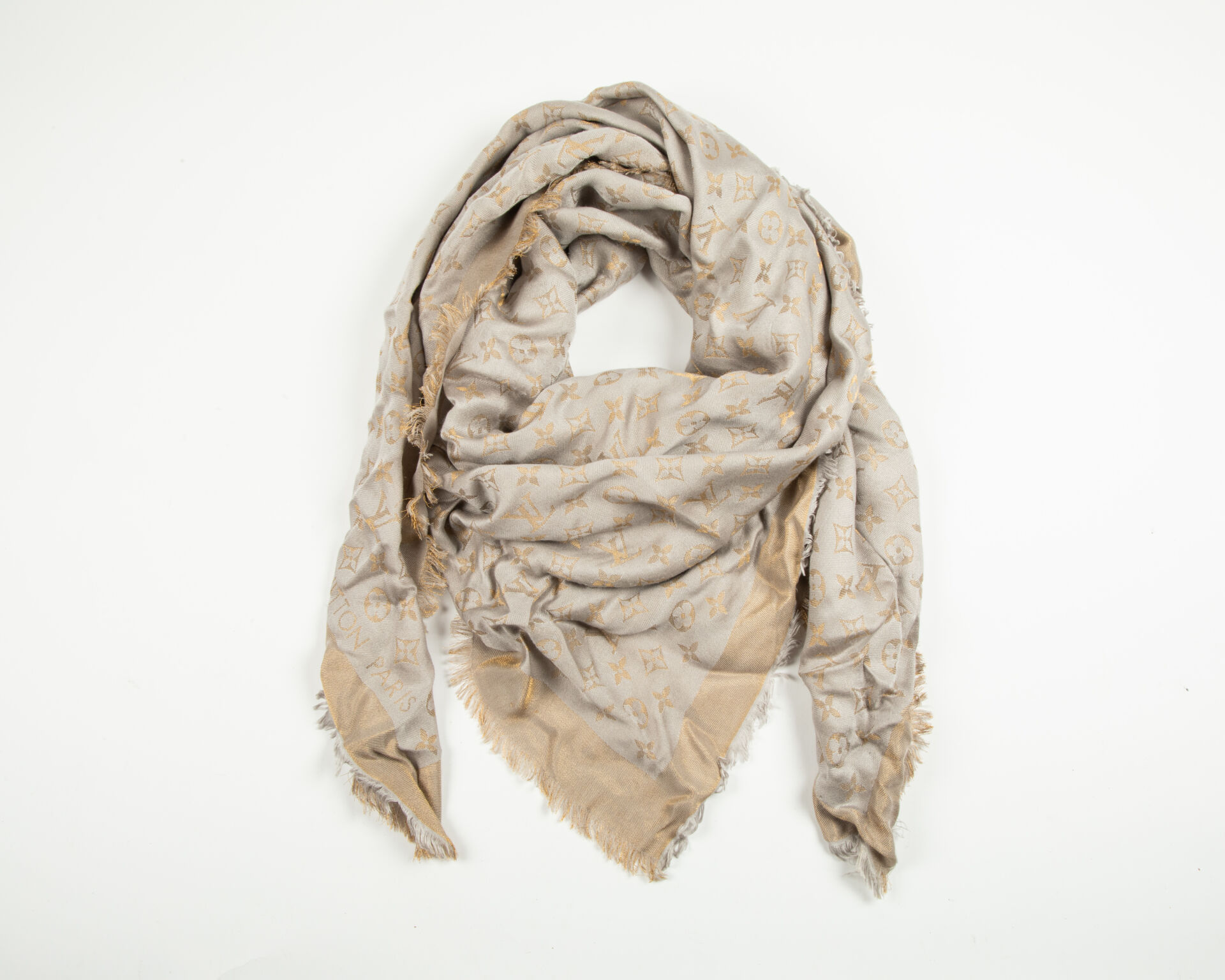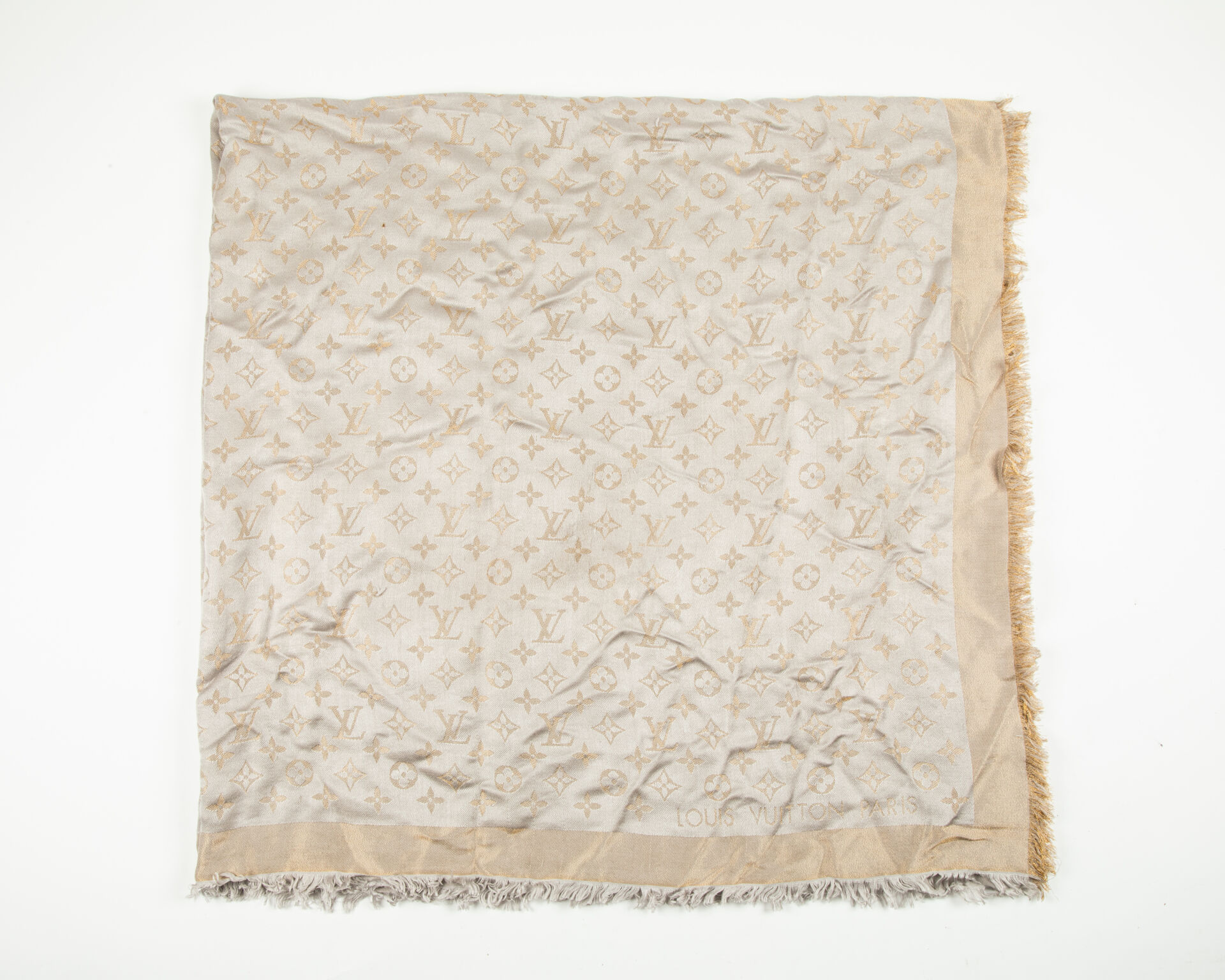 215 ESTIMATION: 60 / 80 € LOUIS VUITTON Modèle Shine – Châle en jacquard monogram doré sur fond gris Quelques fils tirés, trou et traces de frottement Dimensions : 135 x 135 Dans un coffret
