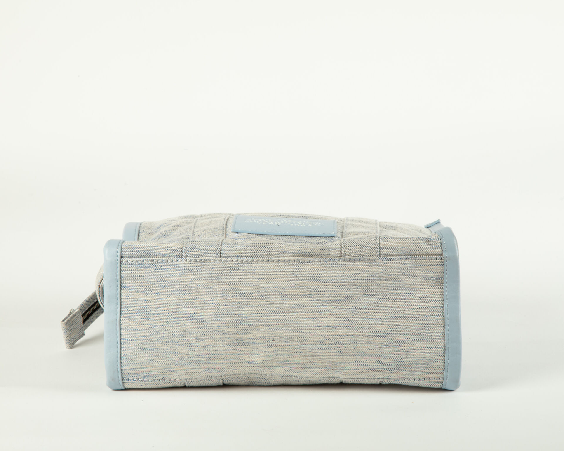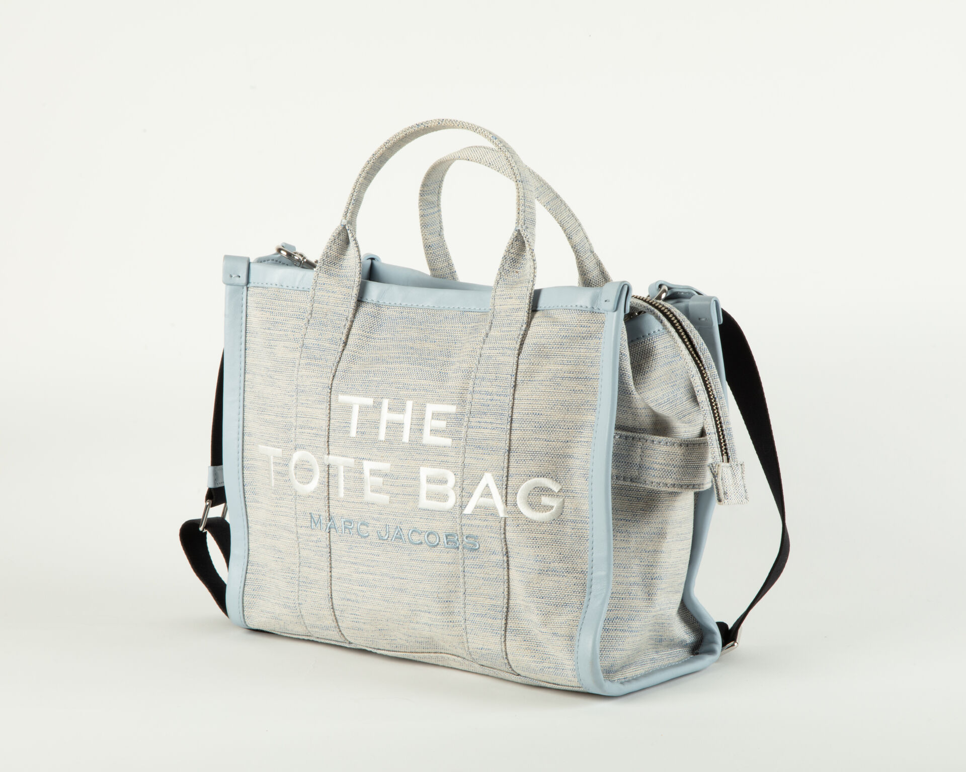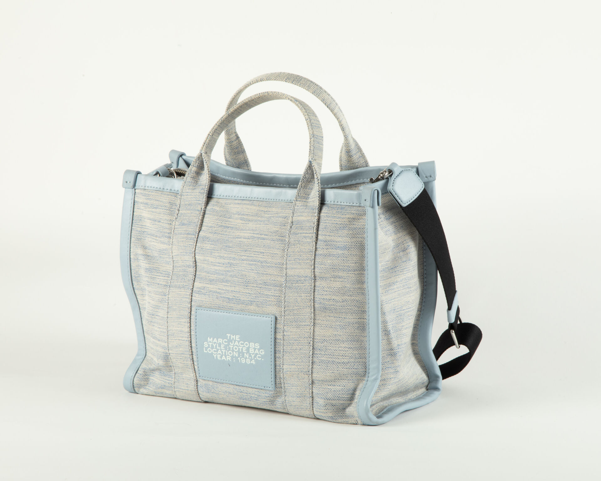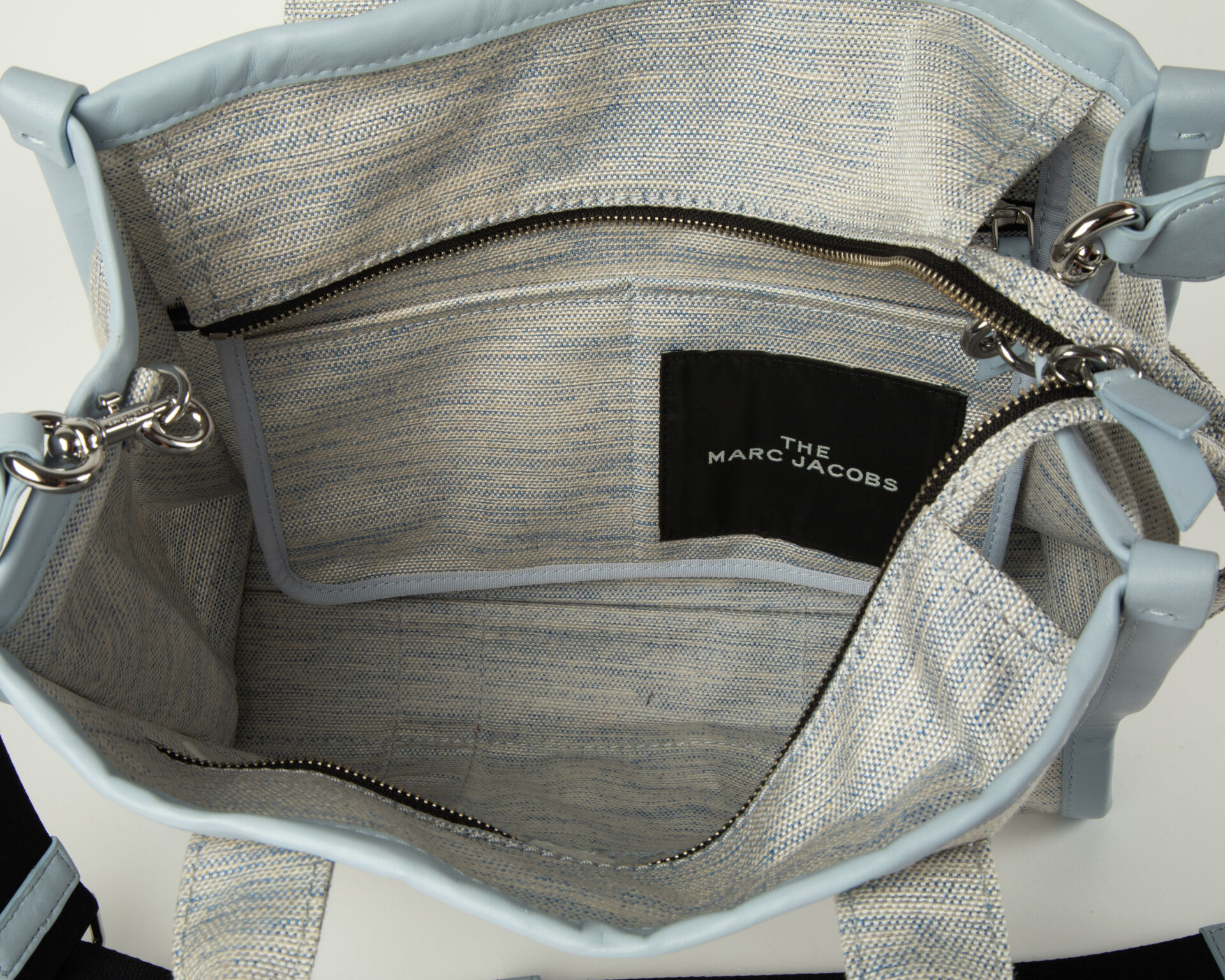 Modèle The Tote Bag – Sac cabas en toile chinée bleu ciel à deux anses et une bandoulière, empiècements en cuir bleu ciel, accastillage en métal argenté, fermeture zippée, intérieur à deux poches plaquées et une poche zippée.