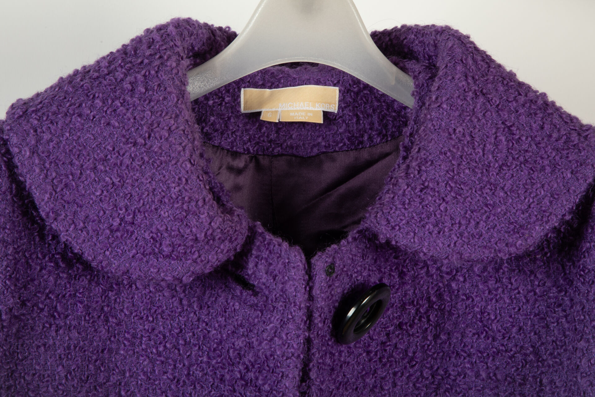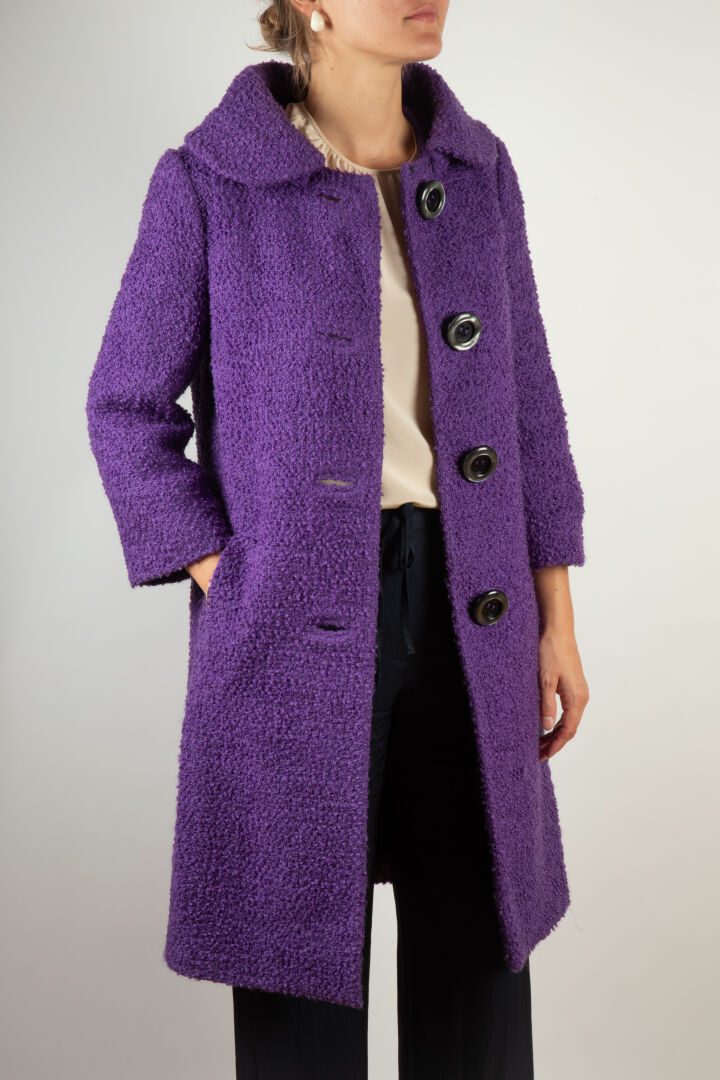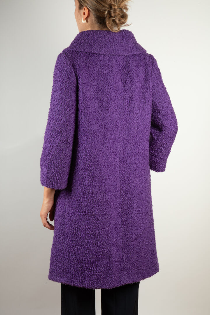 Manteau en laine vierge, mohair et polyamide à bouclette violet, col claudine, deux poches plaquées, fermant par quatre importants boutons