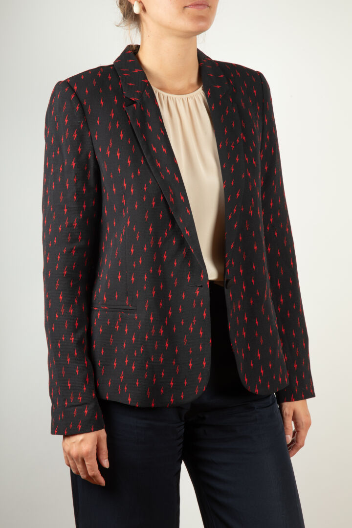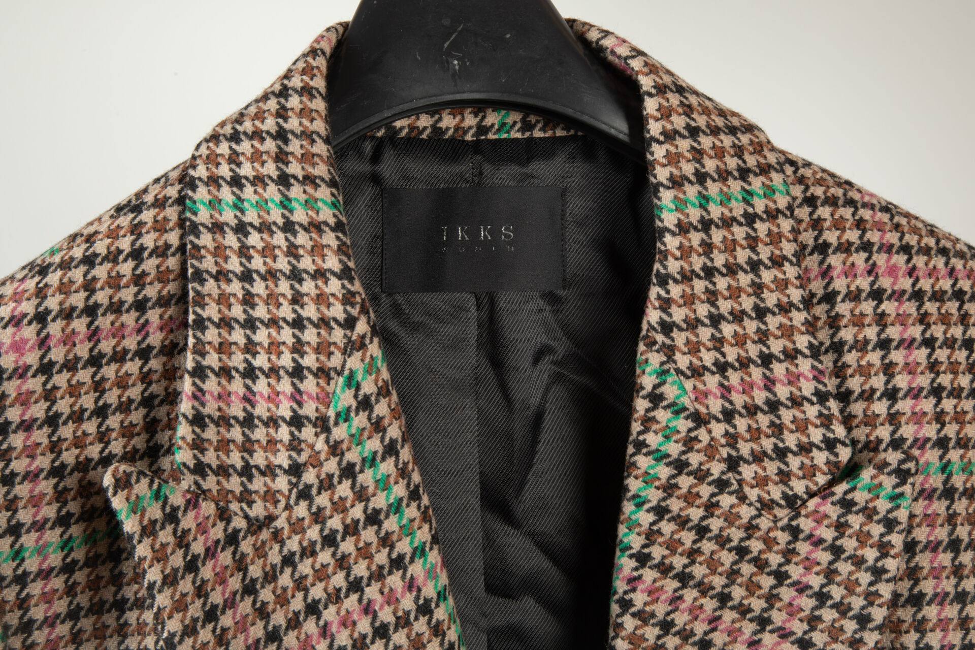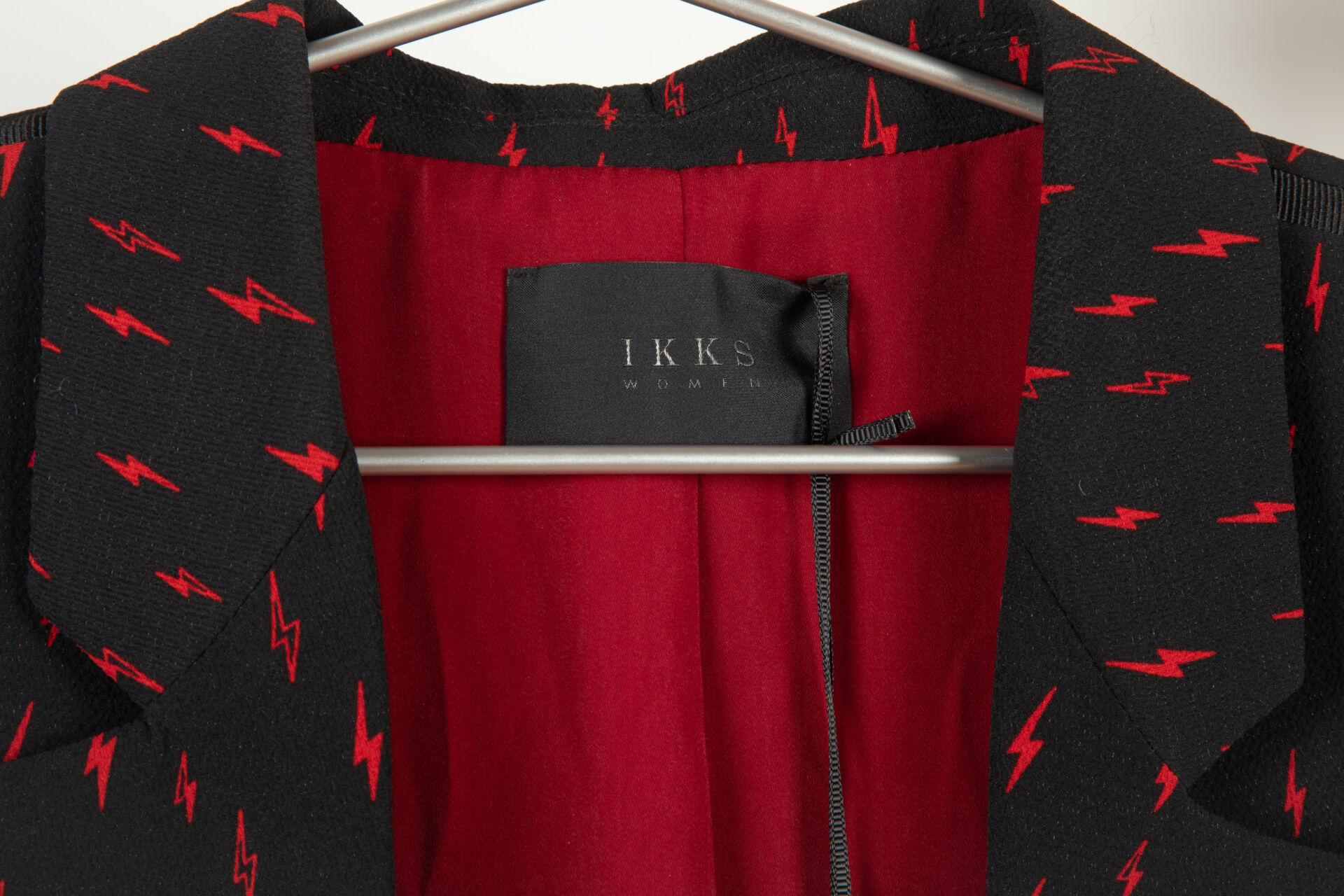 On y joint deux vestes de costume de marque IKKS, l’une à motif de pied de poule polychrome sur fond marron (Taille 40), l’autre à décor d’éclairs rouges sur fond noir (Taille M)