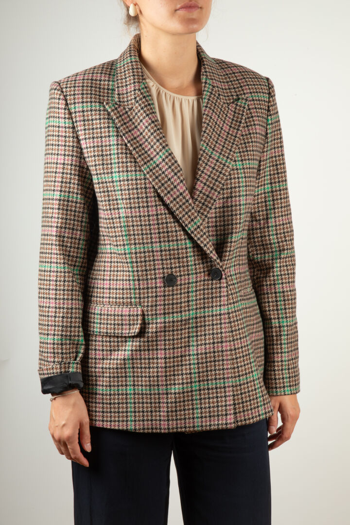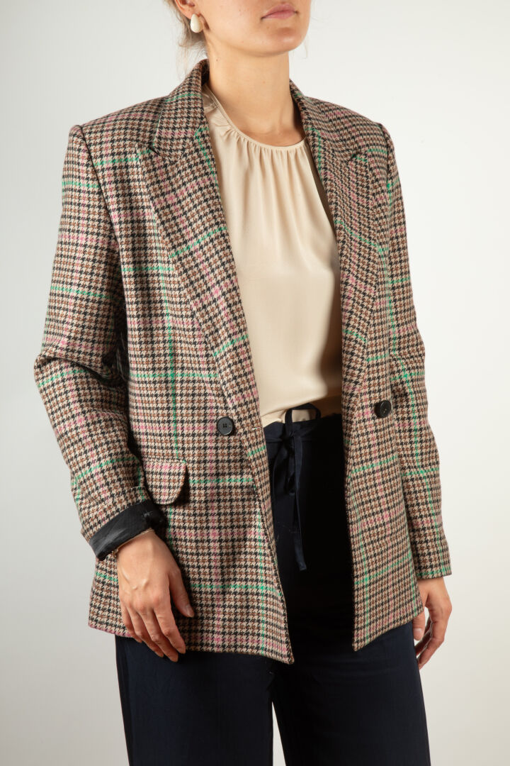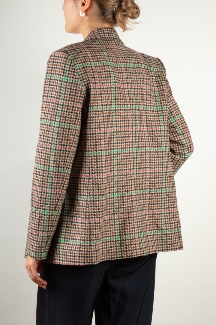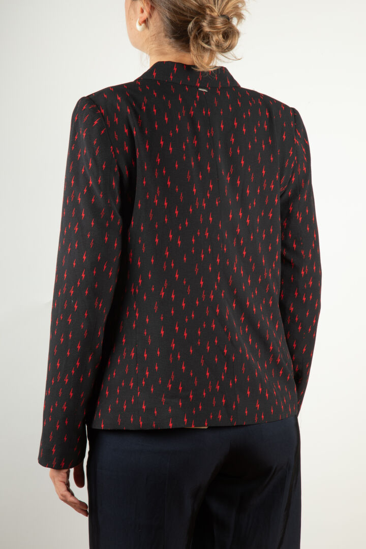On y joint deux vestes de costume de marque IKKS, l’une à motif de pied de poule polychrome sur fond marron (Taille 40), l’autre à décor d’éclairs rouges sur fond noir (Taille M)