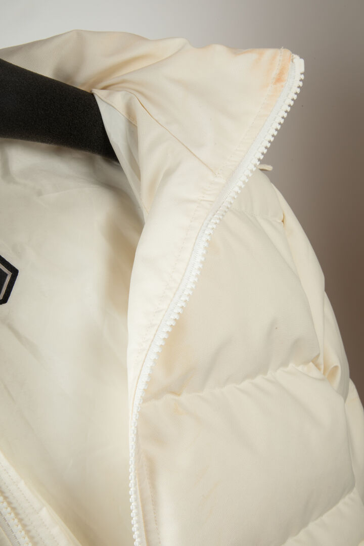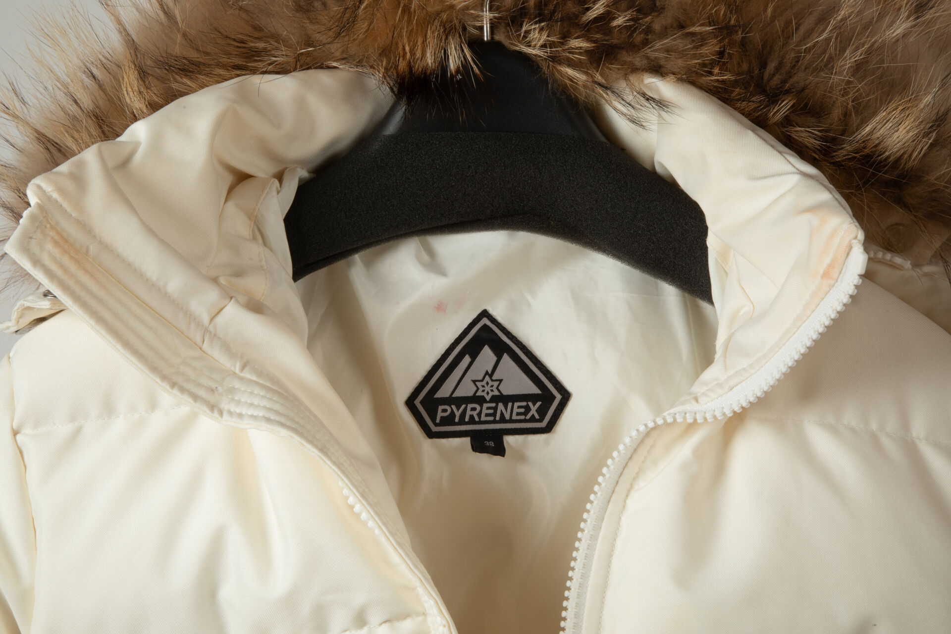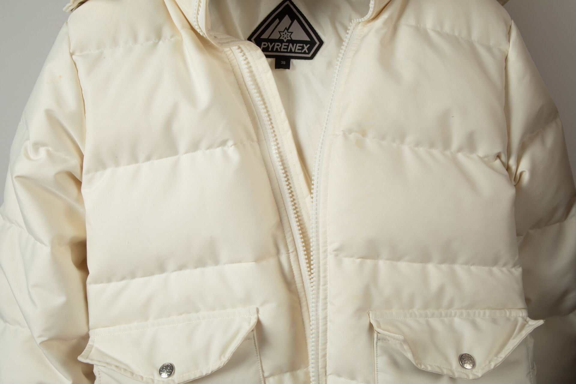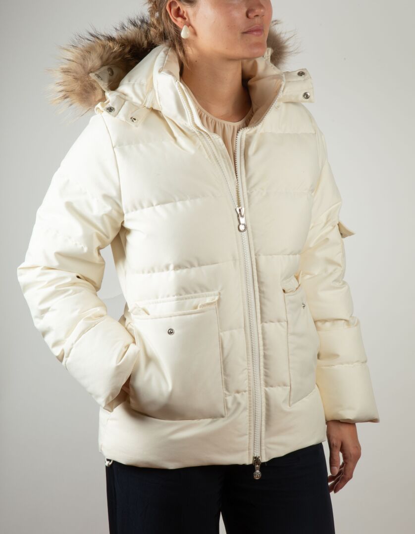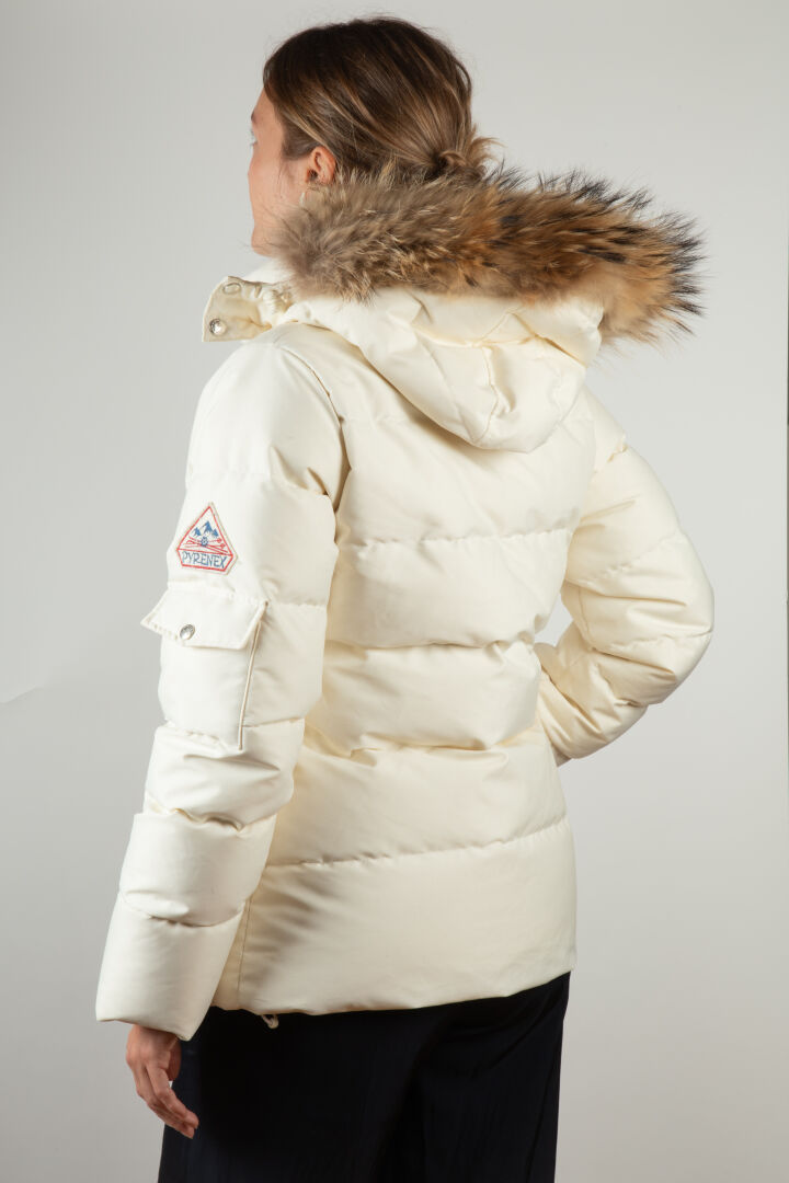 248 ESTIMATION: 50 / 80 € PYRENEX Doudoune écru garnie de duvet d’oie à capuche bordée de fourrure Taille 38 Tâches