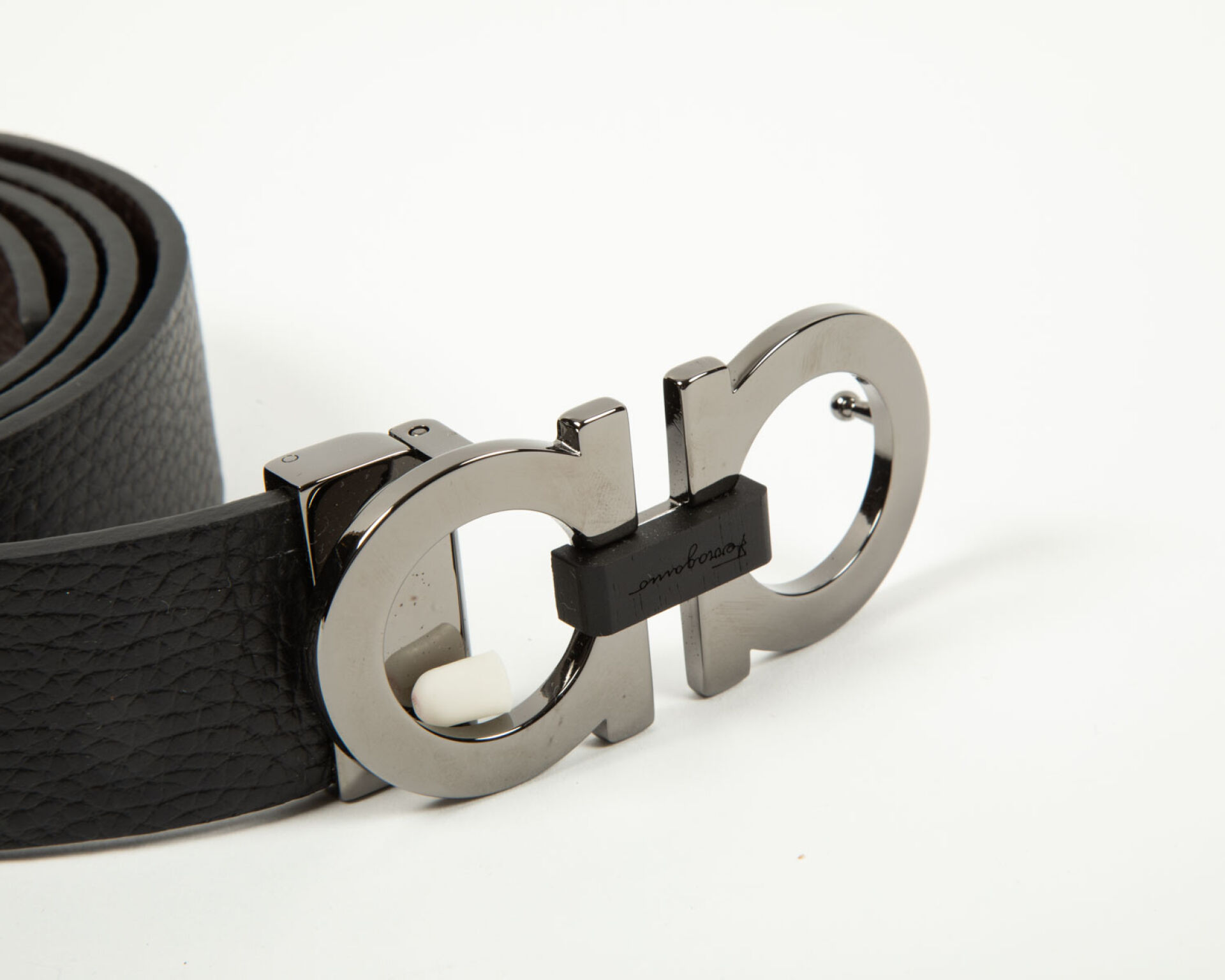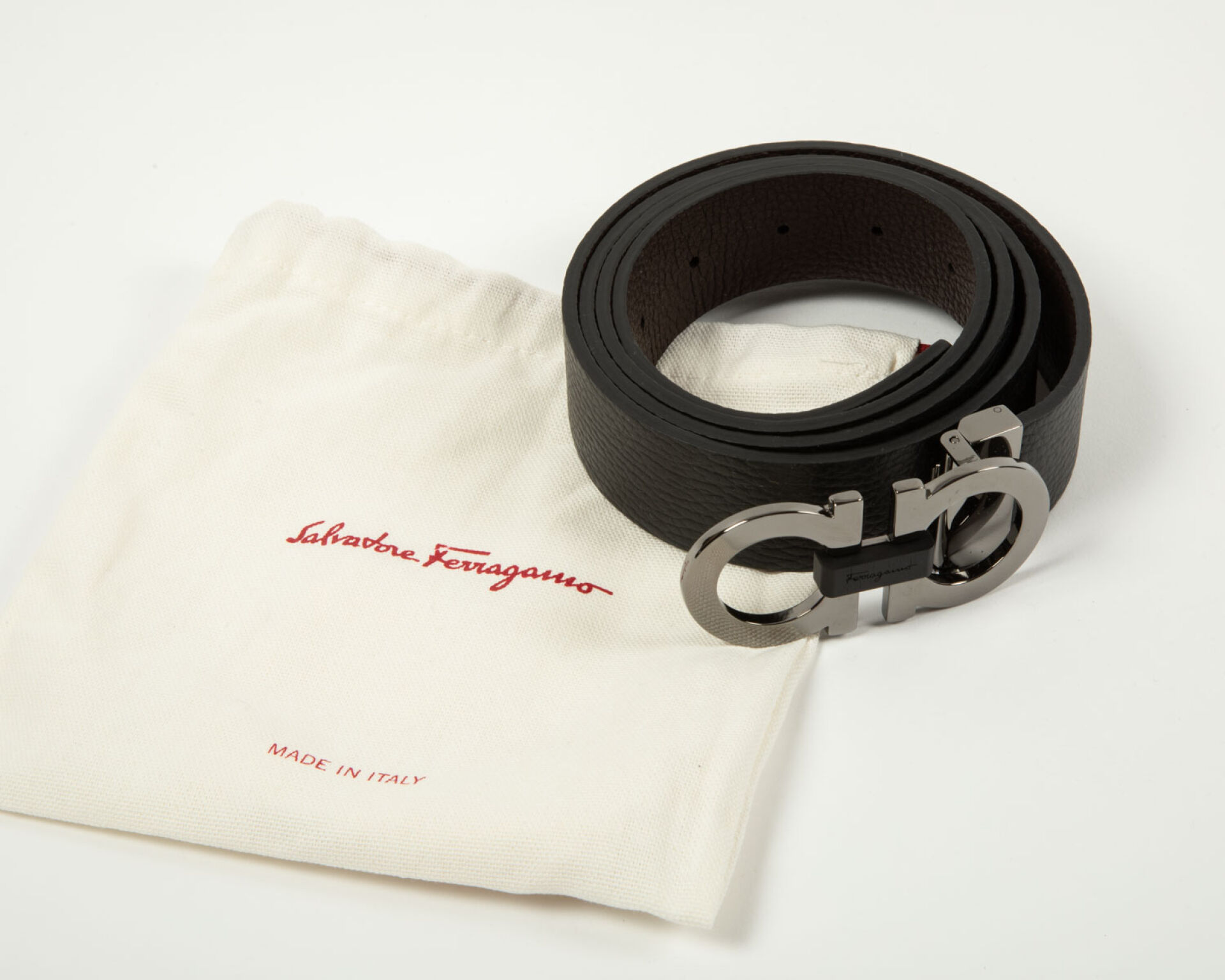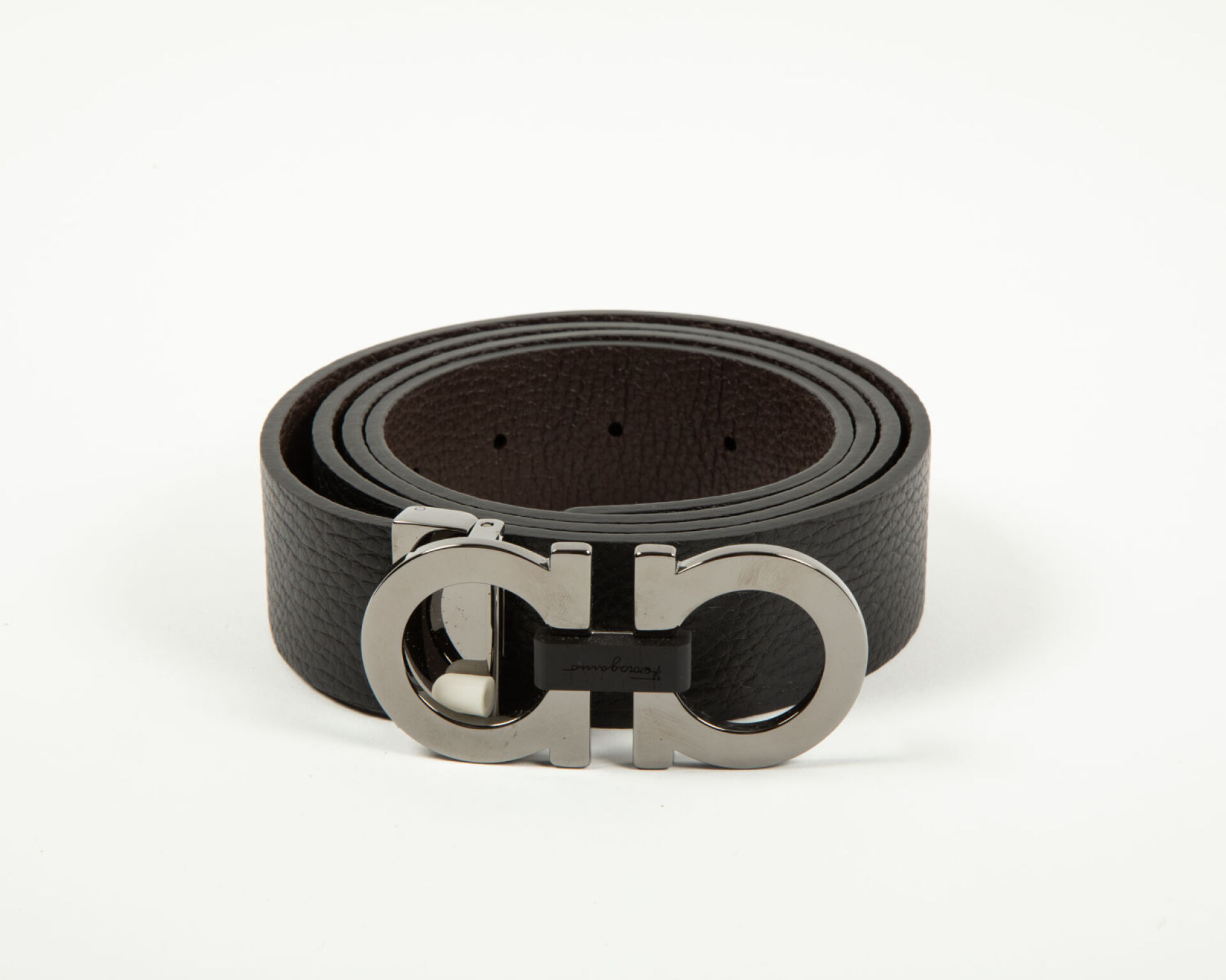 250 ESTIMATION: 30 / 50 € SALVATORE FERRANGAMO Ceinture en cuir grainé réversible noir et chocolat, boucle en métal anthracite Longueur : 125 cm Dans son dustbag