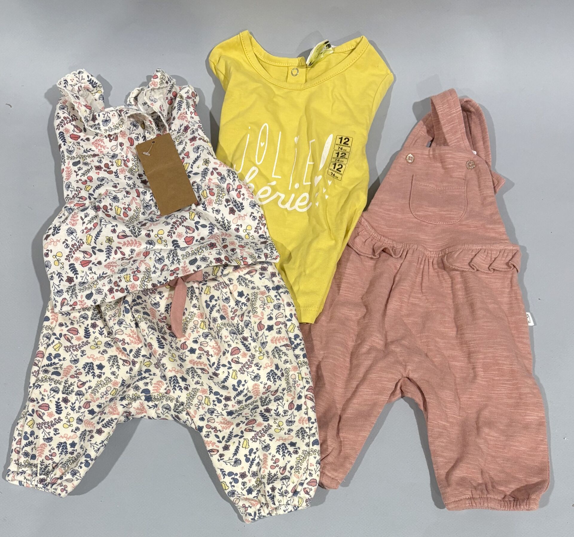Ensemble de 4 vêtements enfant comprenant un pantalon et un tee-shirt à manches longues à décor de fleurs et d’oiseaux sur fond blanc (3 mois), un tee-shirt à manches longues jaune marqué jolie chérie (12 mois) et une salopette en tissu rose (3 mois)
