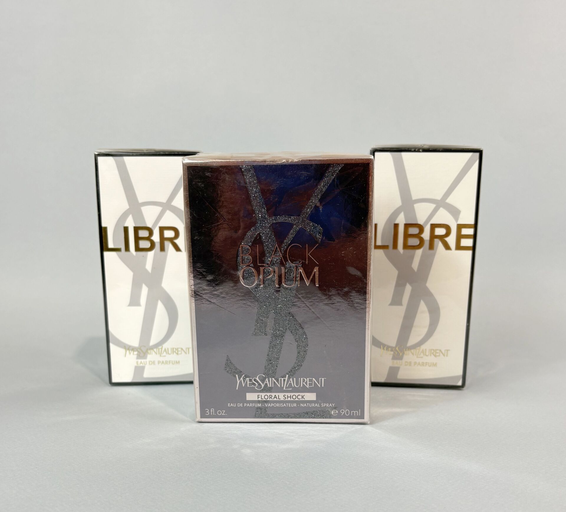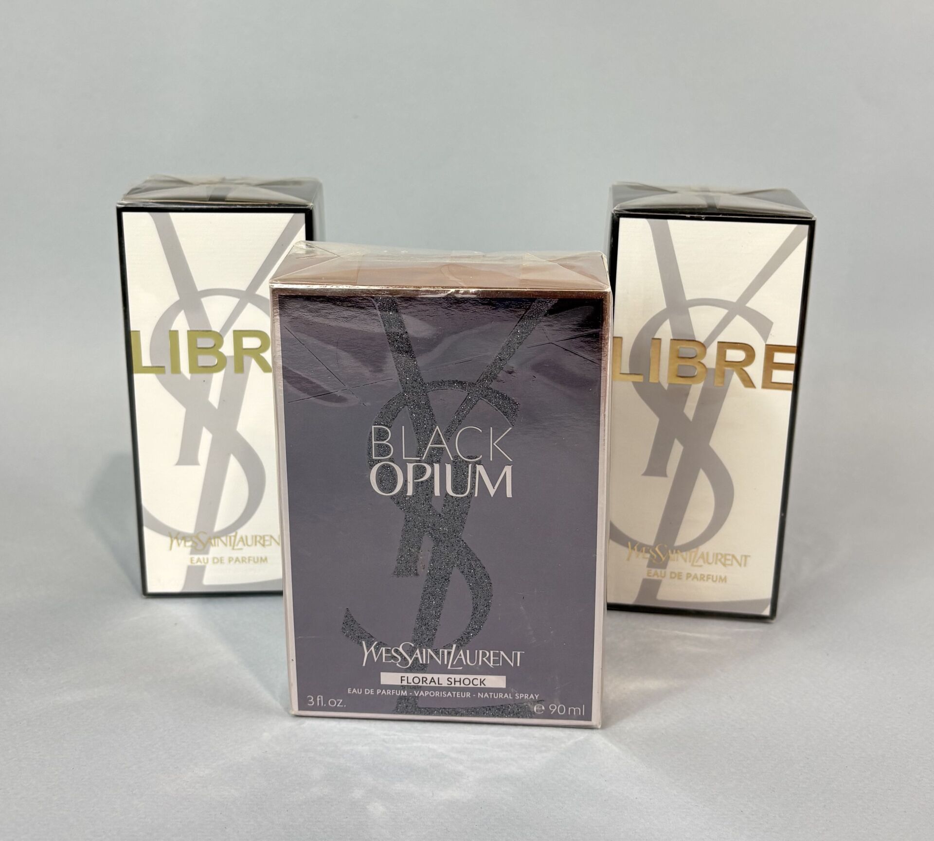 269 ESTIMATION: 10 / 20 € Ensemble de 3 parfums comprenant : – YVES SAINT LAURENT, eau de parfum LIBRE (90ml) – 2 Flacons – YVES SAINT LAURENT, eau de parfum BLACK OPIUM (90ml)