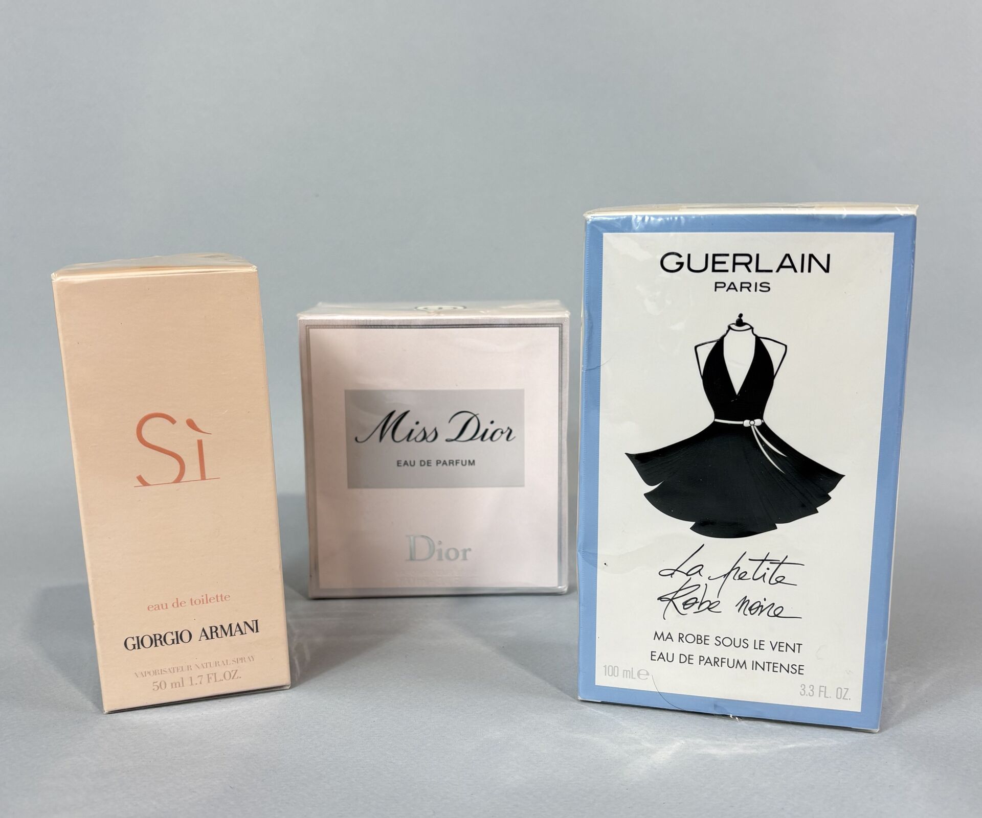 270 ESTIMATION: 60 / 80 € Ensemble de 3 parfums comprenant : – GIORGIO ARMANI, eau de toilette SI (50ml) – MISS DIOR, eau de parfum (100ml) – GUERLAIN, LA PETITE ROBE NOIRE MA ROBE SOUS LE VENT, eau de parfum (100ml)