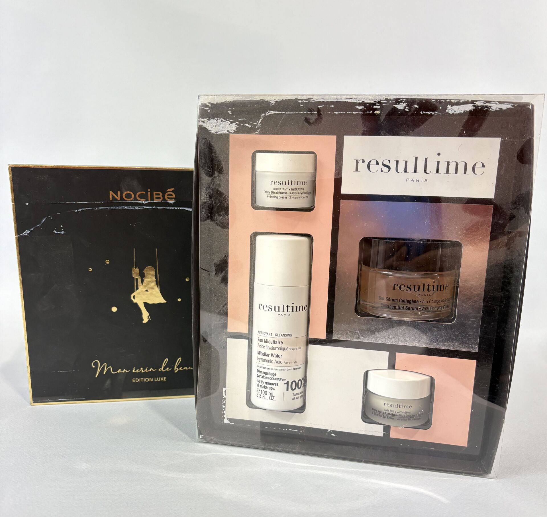 On y joint RESULTIME Paris – Coffret soin du visage comprenant de l’eau micellaire, un gel-sérum collagène, une crème désaltérante et une crème yeux 5 expertises
