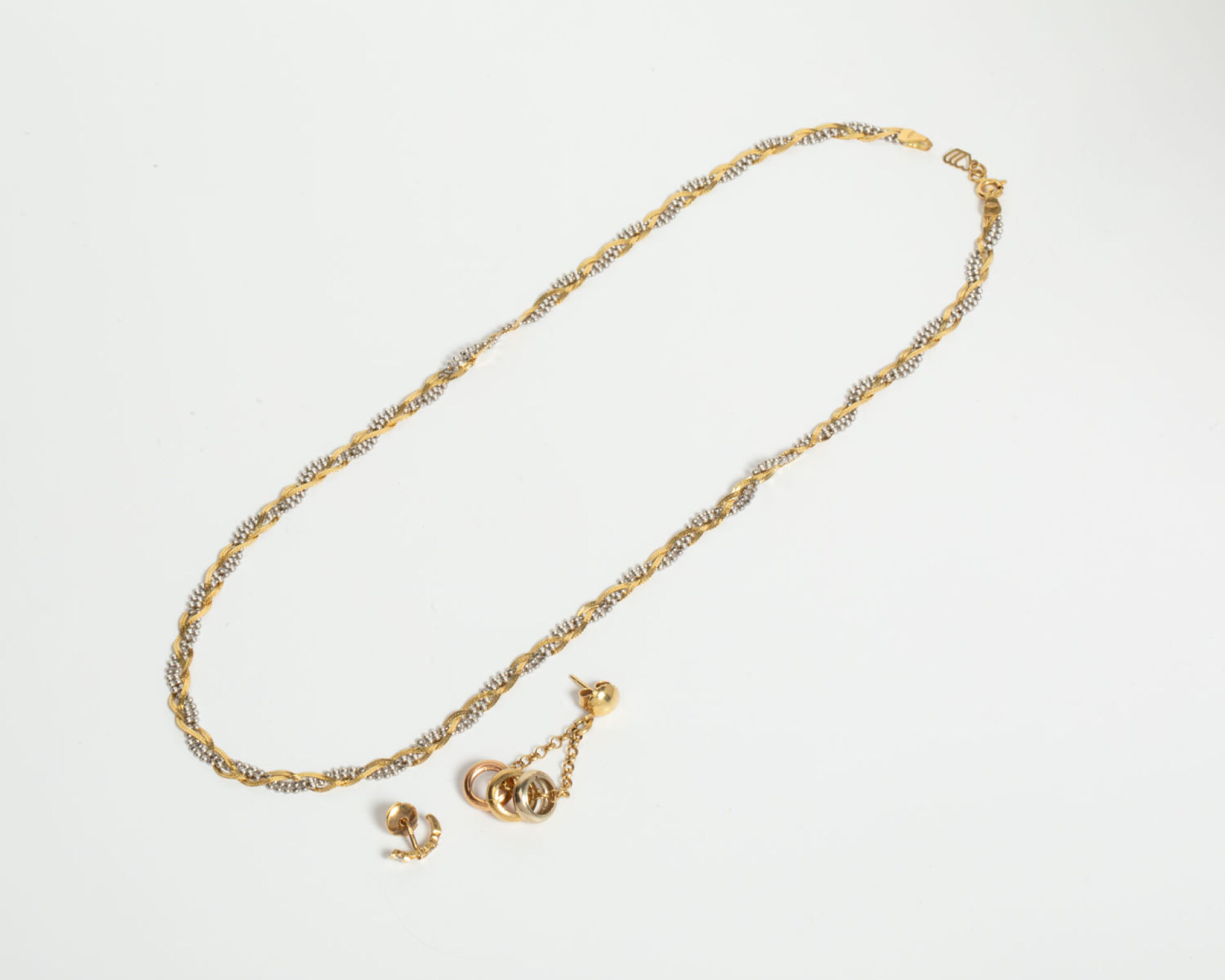 28 ESTIMATION: 350 / 500 € Ensemble de bijoux en or 750 millièmes (18k) et petits diamants soit un collier en deux tons (cassé au fermoir) et deux boucles différentes (manque un diamant). Poids brut : 10,7 g