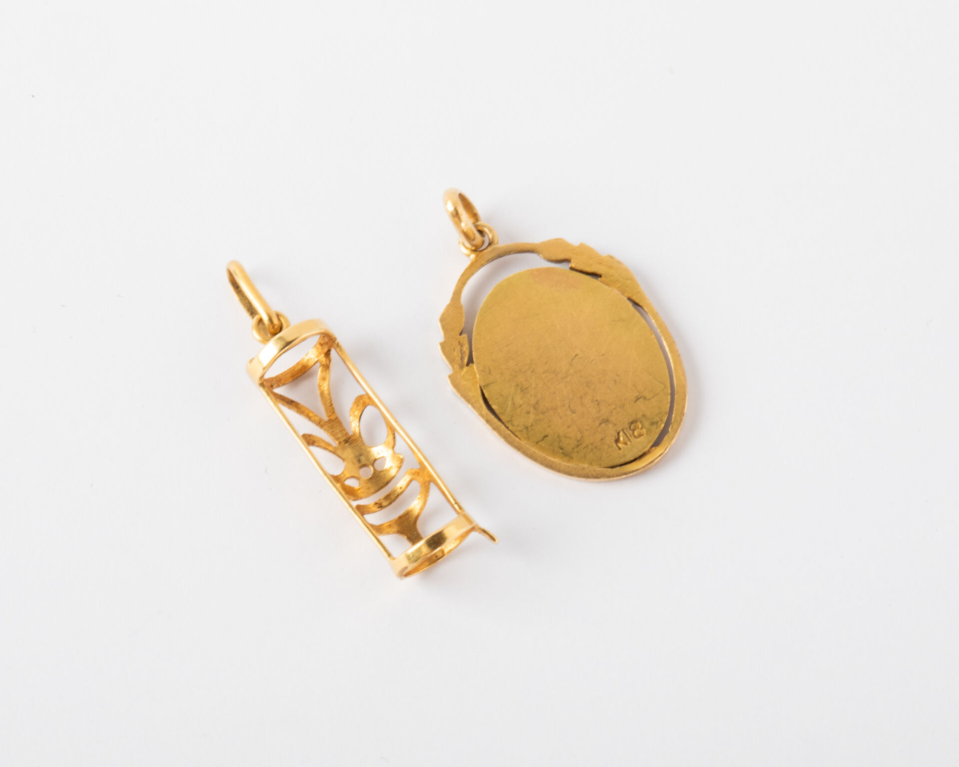 41 ESTIMATION: 100 / 150 € Ensemble en or jaune (750 millièmes) comprenant : – Médaille vierge or – Pendentif tubulaire ajouré Poids : 3 g.