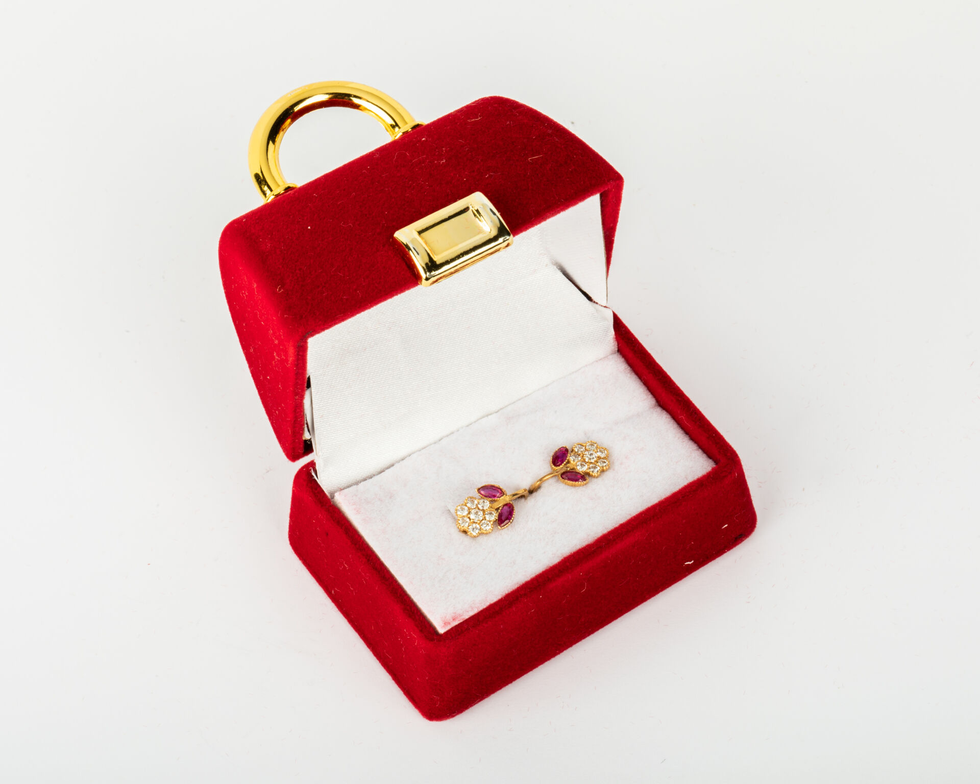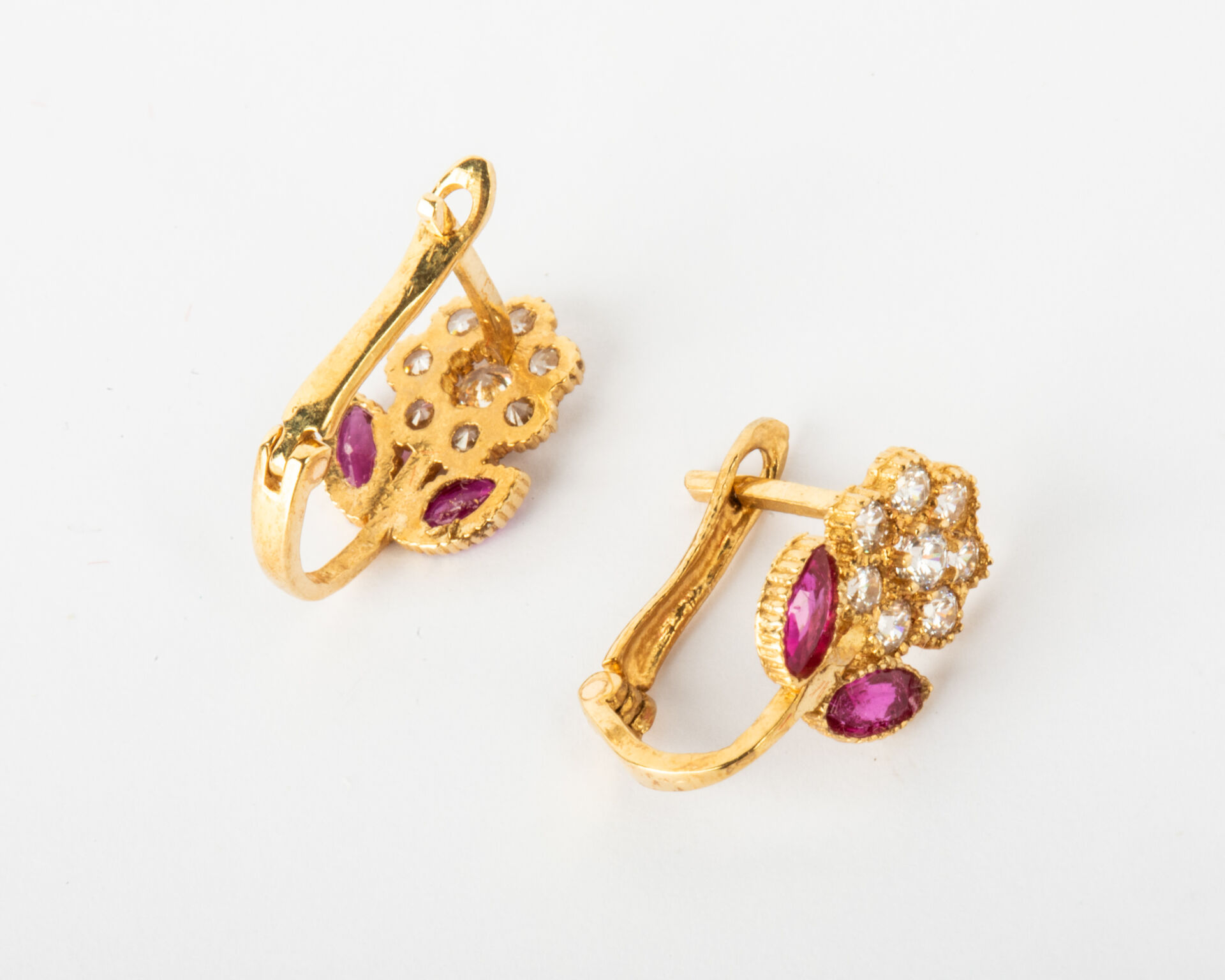 6 ESTIMATION: 35 / 60 € Paire de boucles d’oreilles en or jaune (750 millèmes) à décor de fleurs serties de pierres blanches et spinel rose Poids brut : 1 g