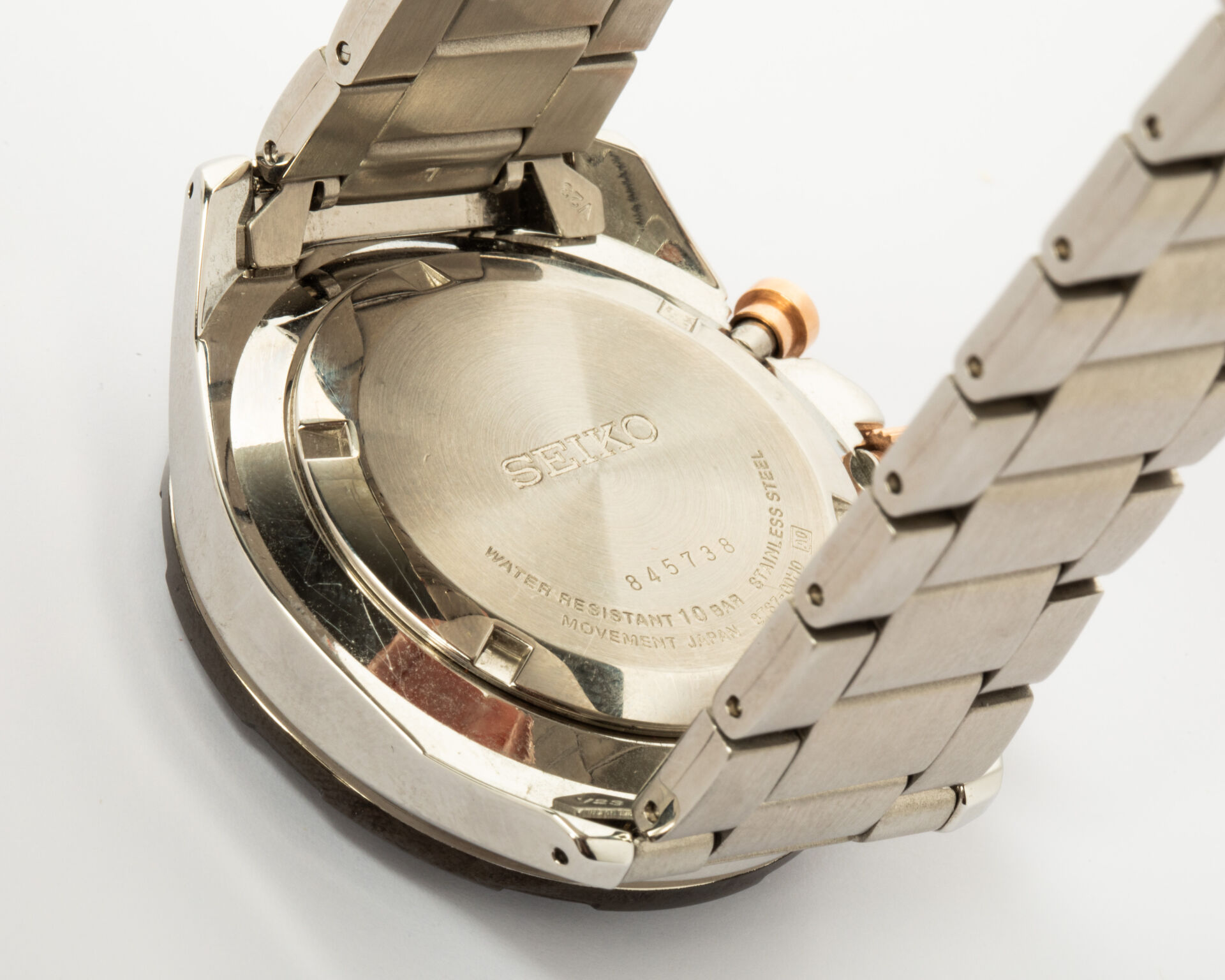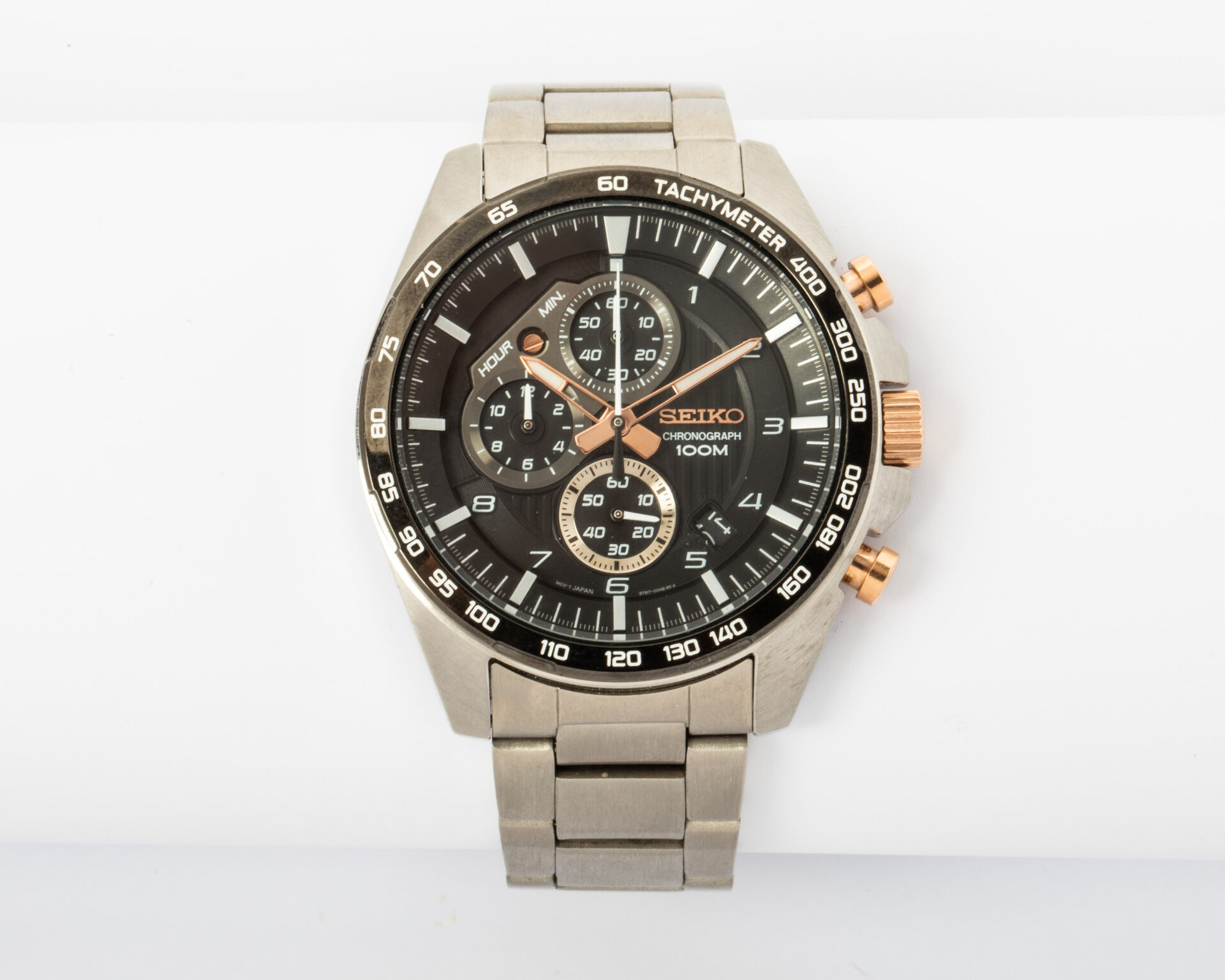 SEIKO Chronomètre. Montre d’homme en acier. Grand boîtier rond avec lunette noircie. Cadran à fond noir à trois compteurs et guichet dateur à 4h30. Mouvement quartz. Bracelet articulé.