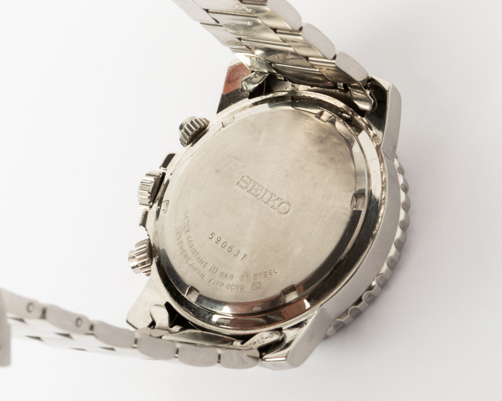 71 ESTIMATION: 30 / 60 € SEIKO Chronographe. Montre d’homme en acier. Boîtier rond avec lunette noire graduée. Cadran sign à fond noir à trois compteurs et guichet dateur à 3h. Mouvement quartz ( abîmé). Bracelet articulé.