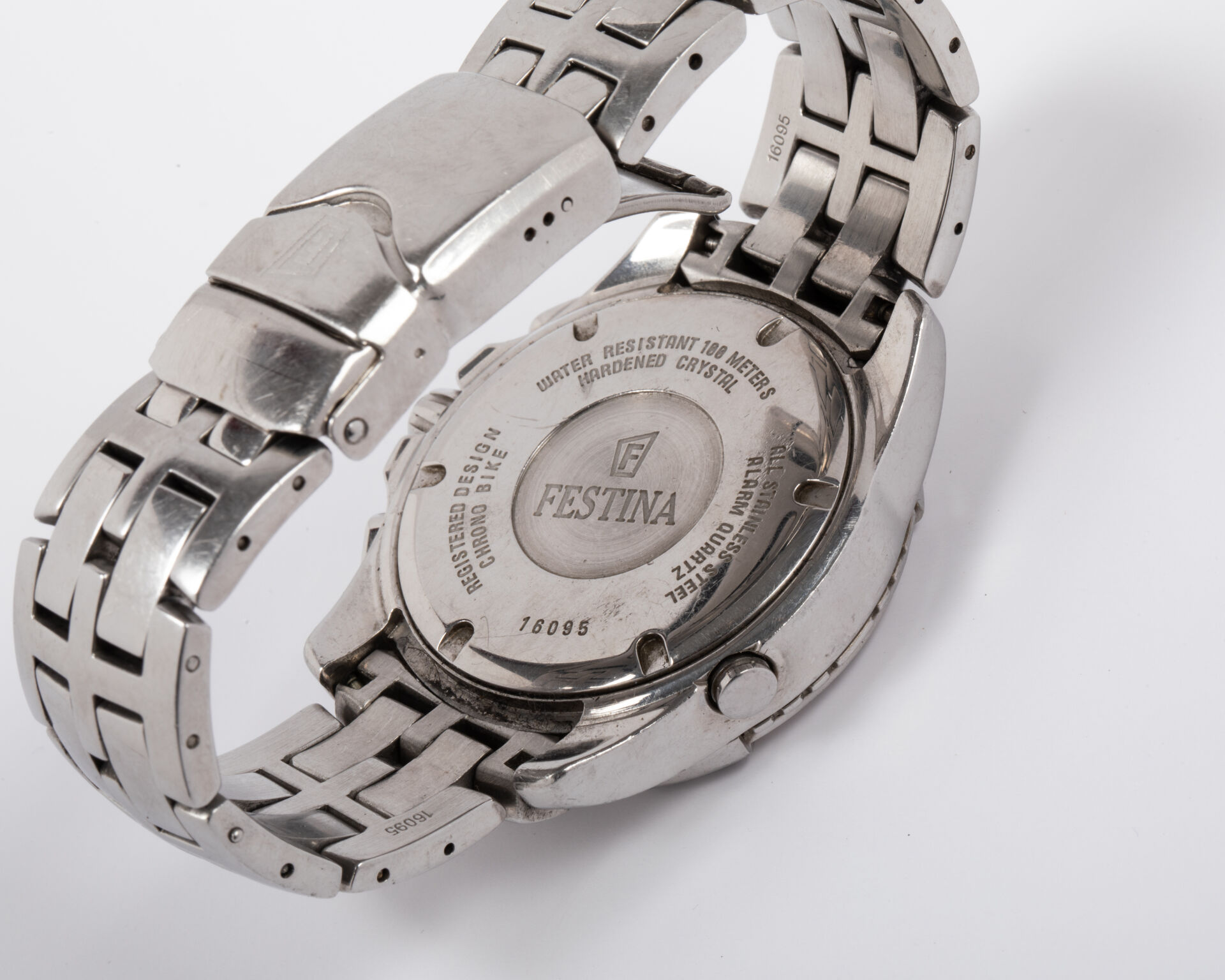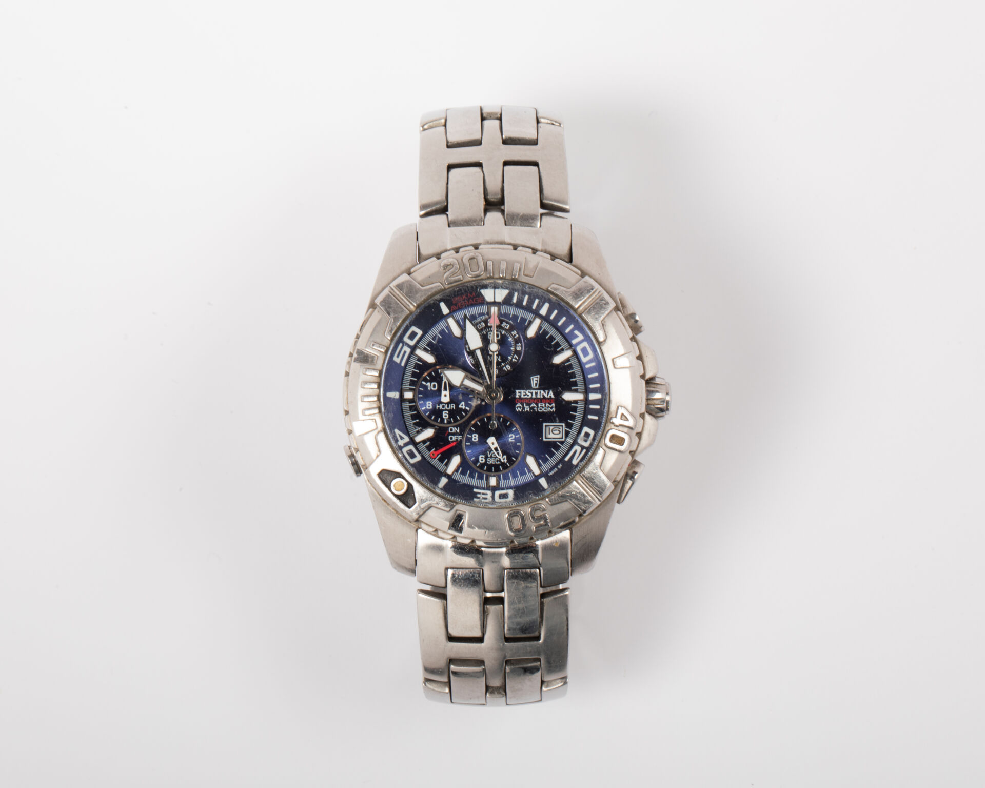 Montre bracelet d’homme chronographe en acier, cadran à fond bleu marine à trois sous cadrans, à index bâton pour les heures, dateur entre 3h et 4h, mouvement à quartz, bracelet en acier à boucle déployante.