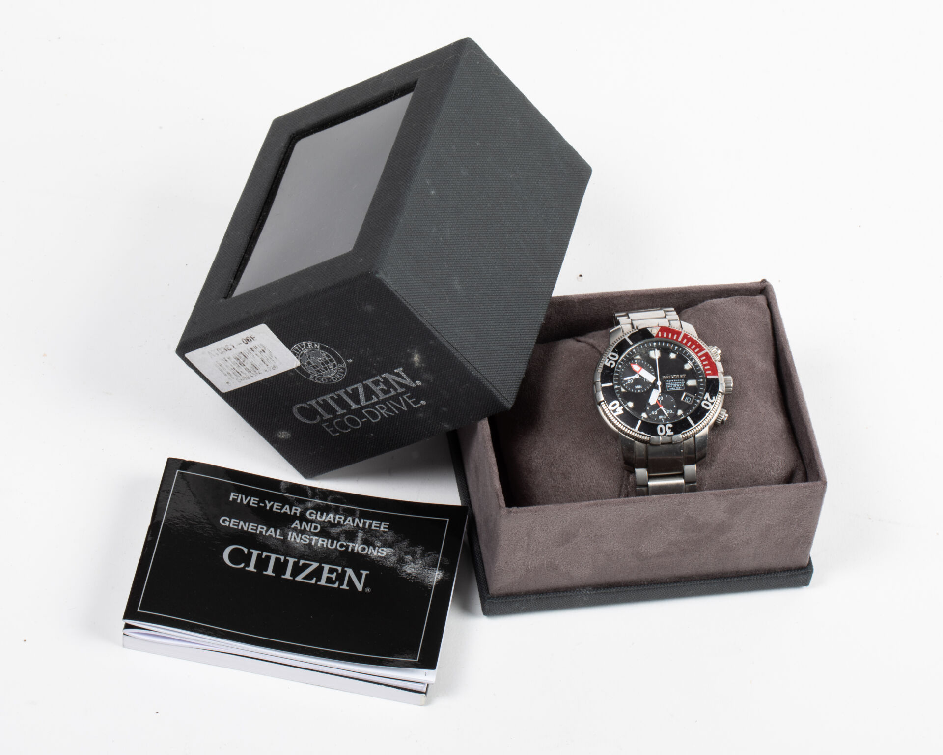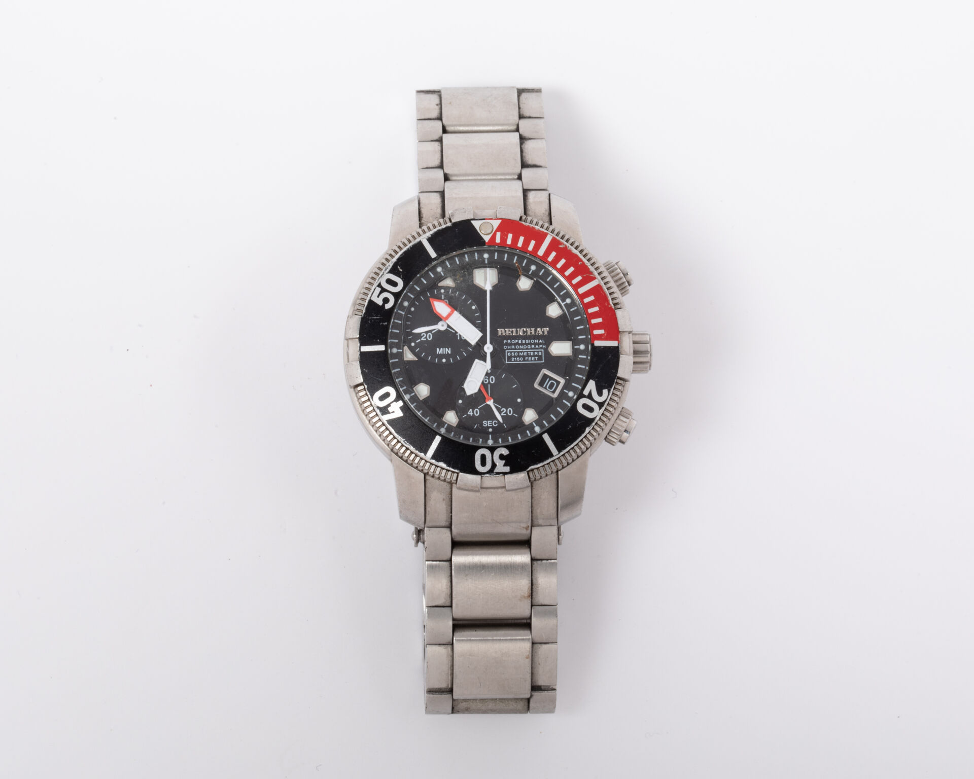 Montre bracelet d’homme professional chronograph en acier, cadran à fond noir à deux sous cadrans, à index bâton pour les heures, dateur entre 4h et 5h, mouvement à quartz, bracelet en acier à boucle déployante