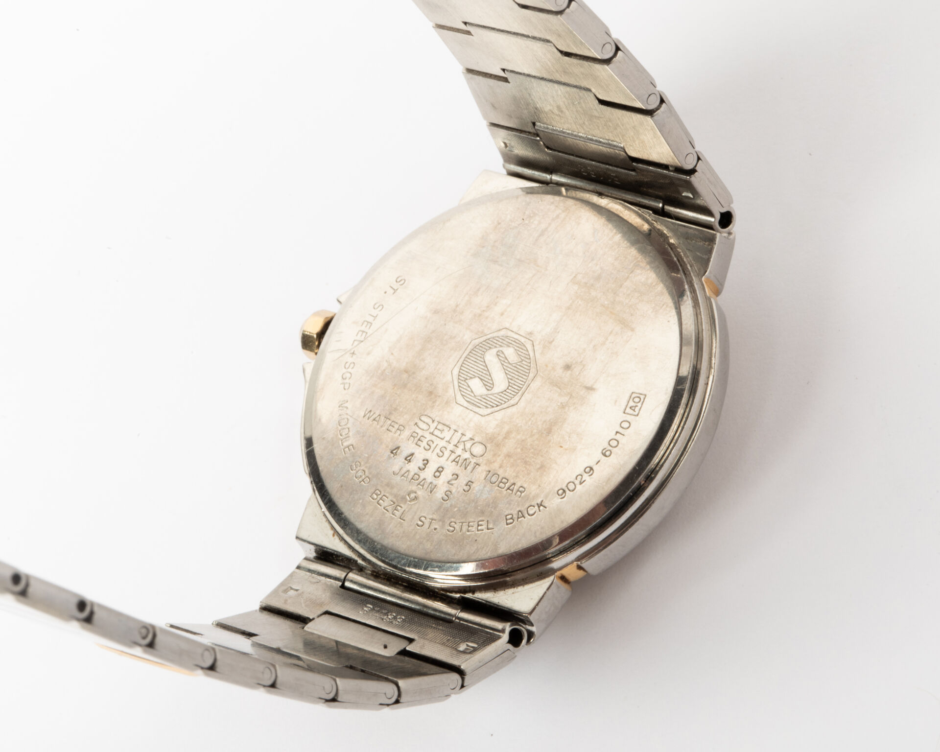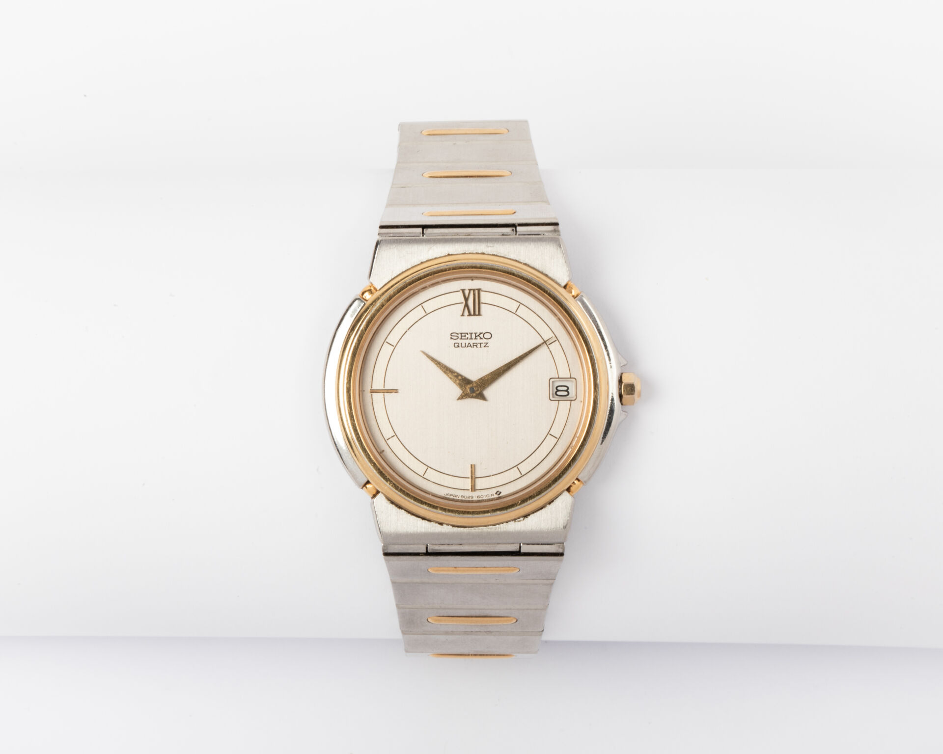 79 ESTIMATION: 40 / 60 € SEIKO. Montre d’homme en acier et acier doré. Guichet dateur à 3h. Mouvement( pile absente). Rayures
