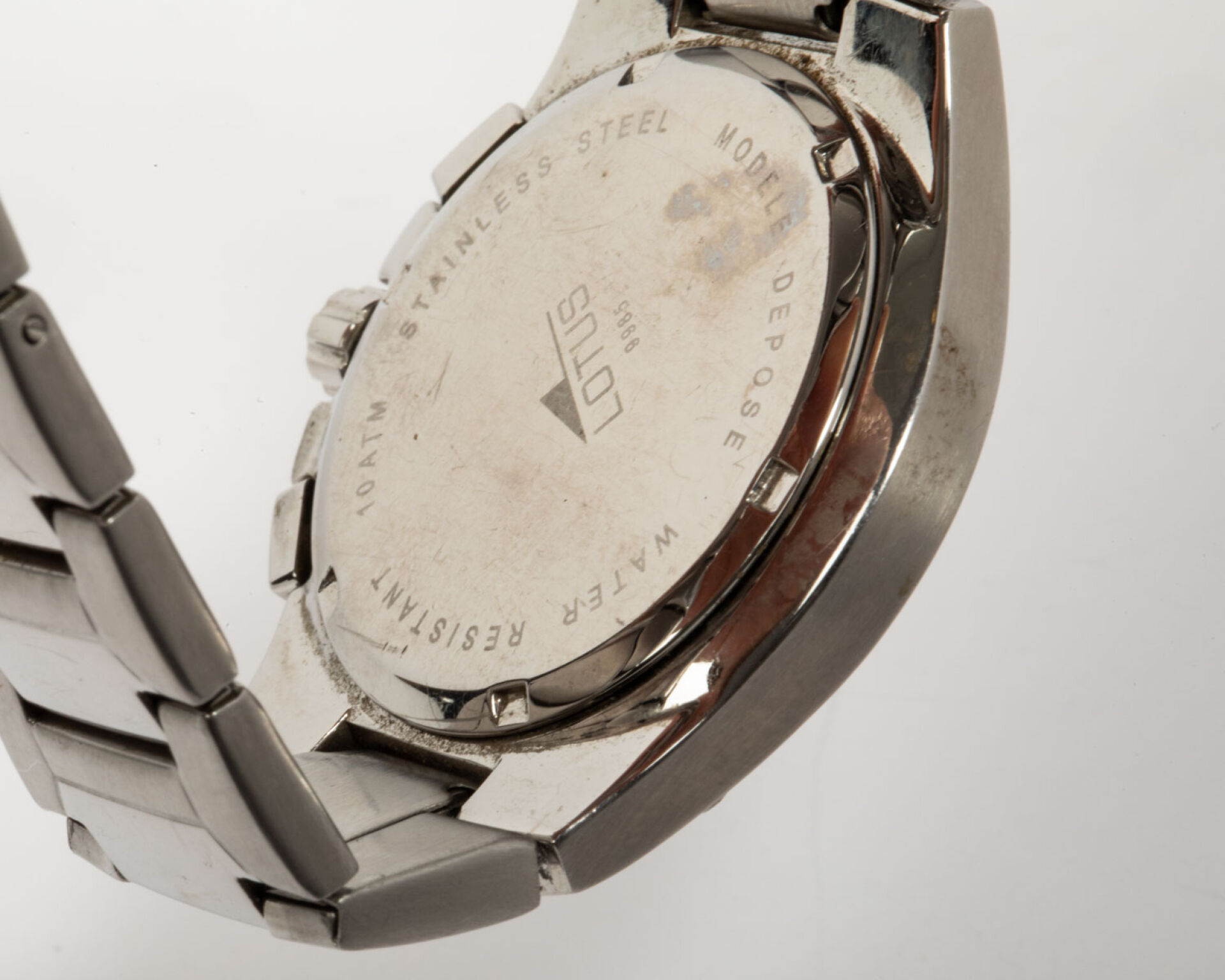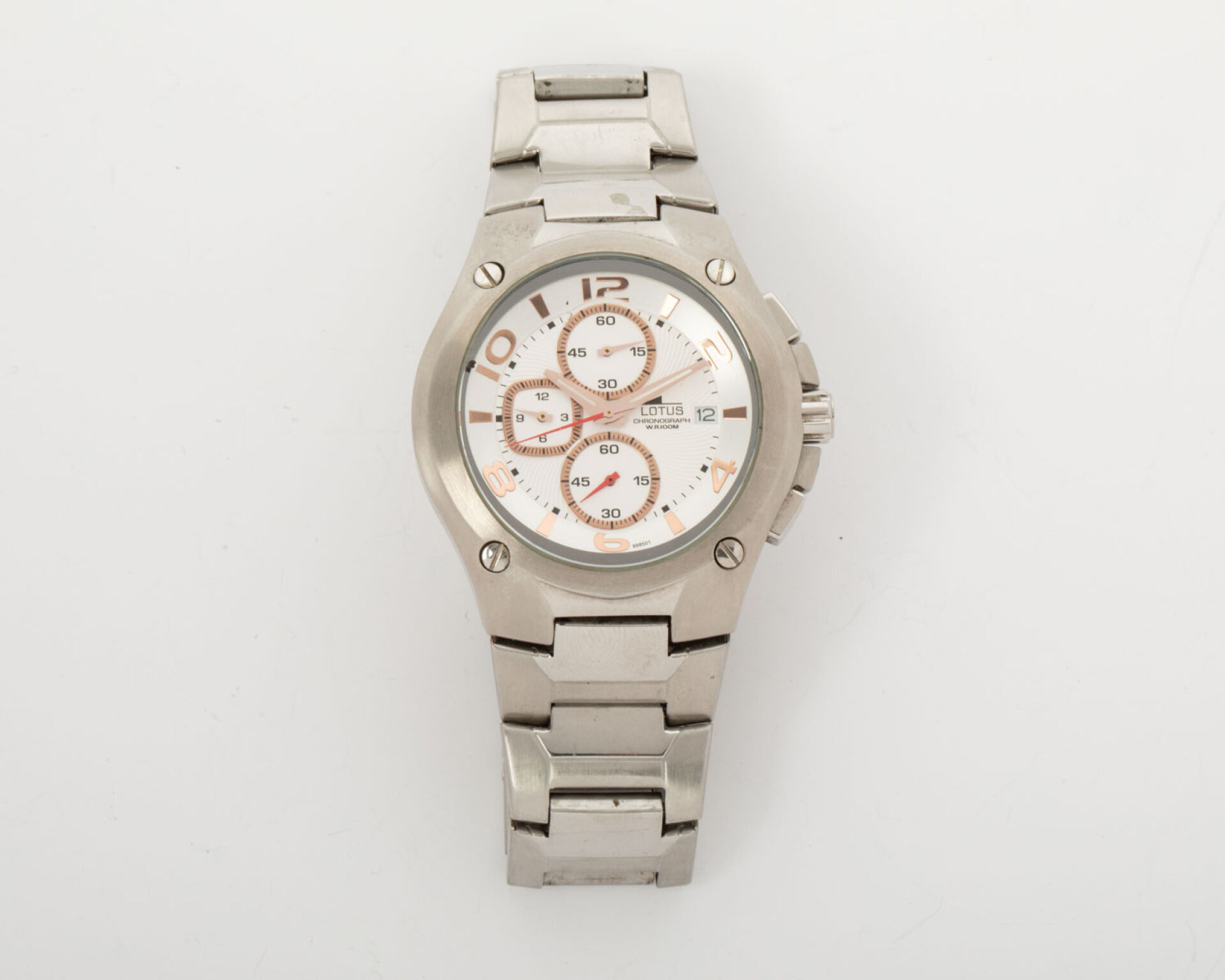 82 ESTIMATION: 30 / 50 € LOTUS Montre homme modèle Chronograph W Ridon, monture en acier, cadran fond blanc à chiffres arabes façon or rose à trois cadrans et dateur à trois heures
