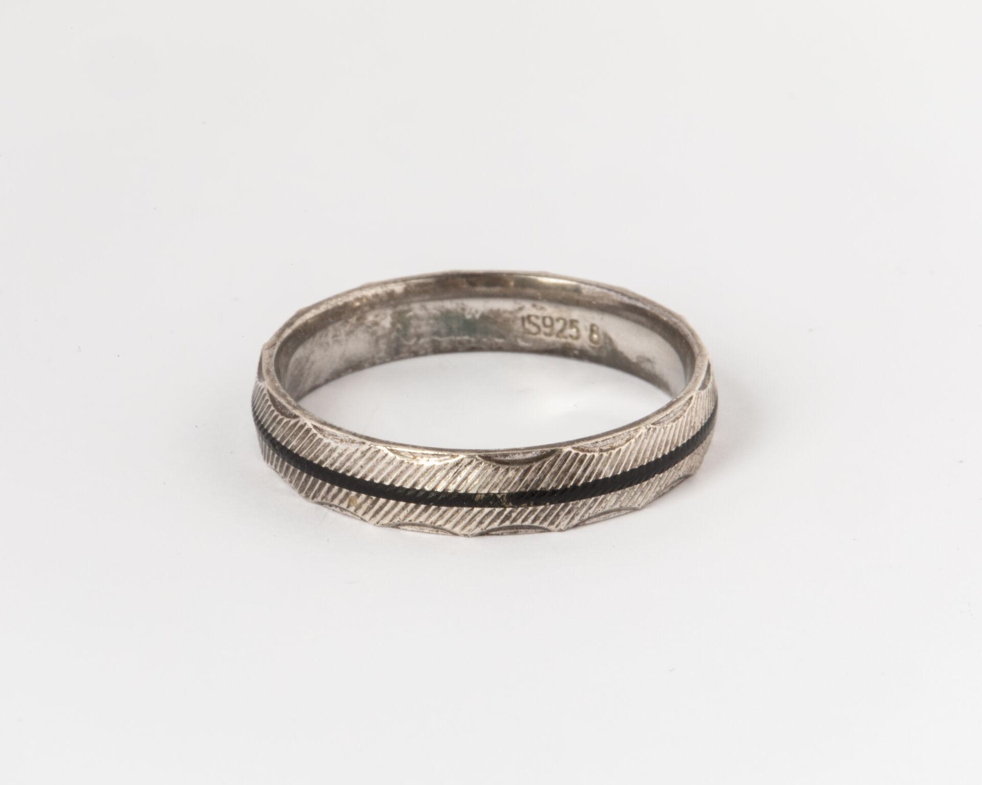 94 ESTIMATION: 5 / 10 € Alliance en argent (925 millièmes) à décor d’un filet noir émaillé Poids Brut : 2.5 g.