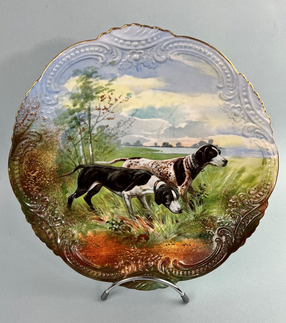 On y joint un plat rond de forme chantournée à décor imprimé de chiens de chasse