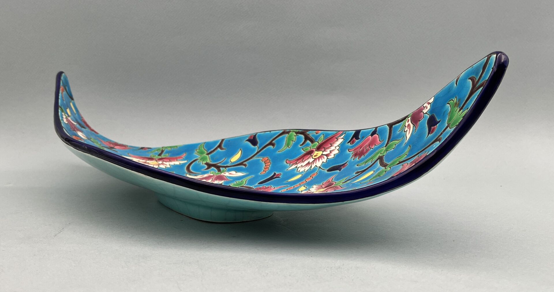 150 RÉSULTAT: 40 € ESTIMATION: 30 / 50 € LONGWY Centre de table en faïence de forme libre à décor émaillé de fleurs L : 45.5 cm On y joint une pelle à tarte en faïence à décor émaillé de fleurs L : 23 cm
