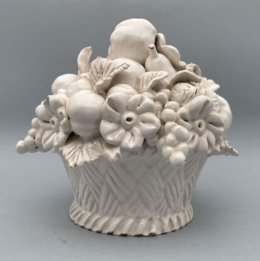 173 RÉSULTAT: 60 € ESTIMATION: 30 / 50 € Centre de table en terre cuite vernissée figurant une corbeille de fleurs et de fruits H : 24 – D : 30 cm environ Légers accidents