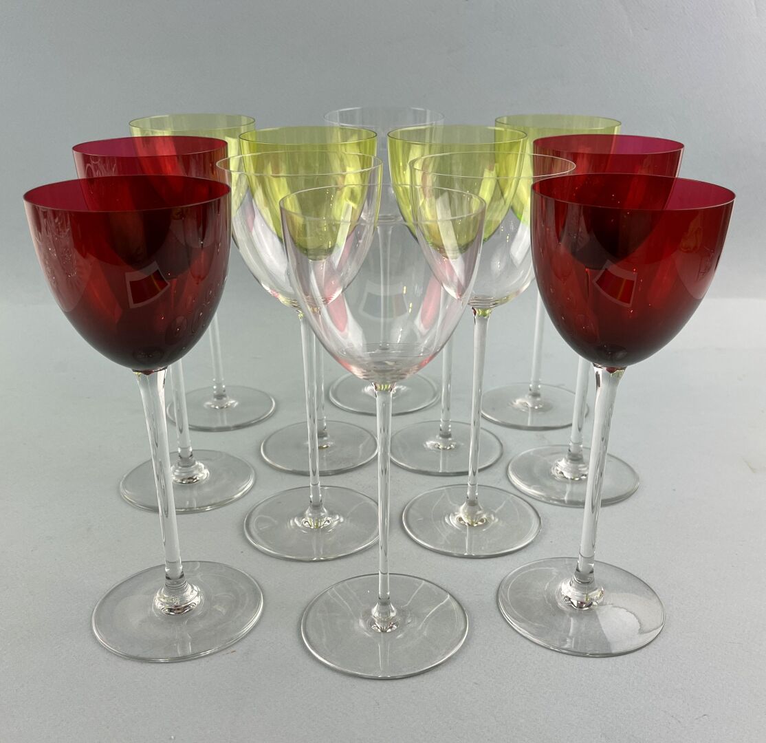 198 ESTIMATION: 300 / 400 € BACCARAT – Modèle Perfection Suite de 12 verres à vin du Rhin en cristal incolore, rouge et vert H : 19 – D : 7.5 cm