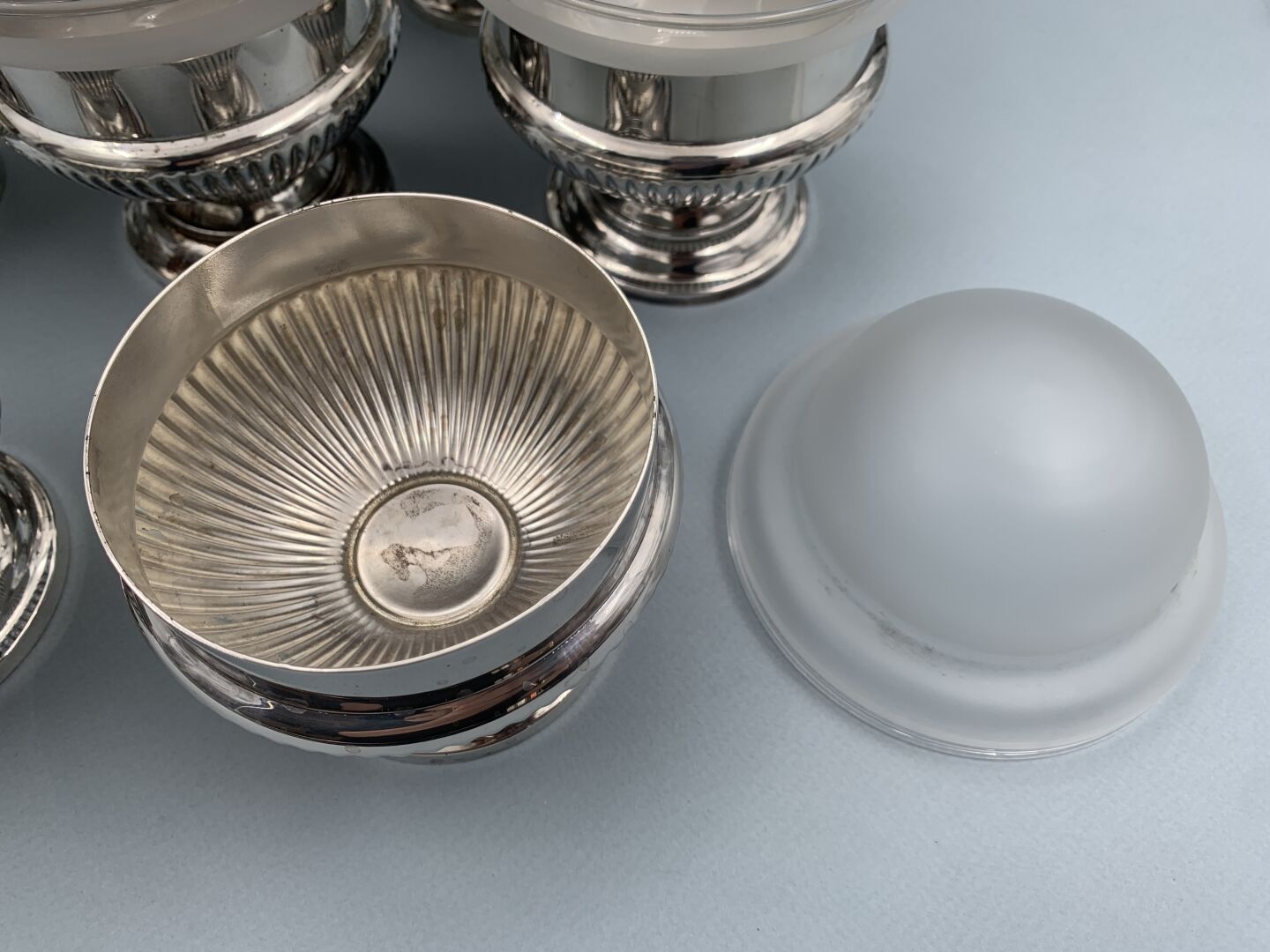 66 RÉSULTAT: 230 € ESTIMATION: 80 / 120 € Suite de neuf coupes à glace sur pied douche en métal argenté à décor de godrons, coupelles en verre dépoli (la coupelle amovible) Légères oxydations H : 10 cm