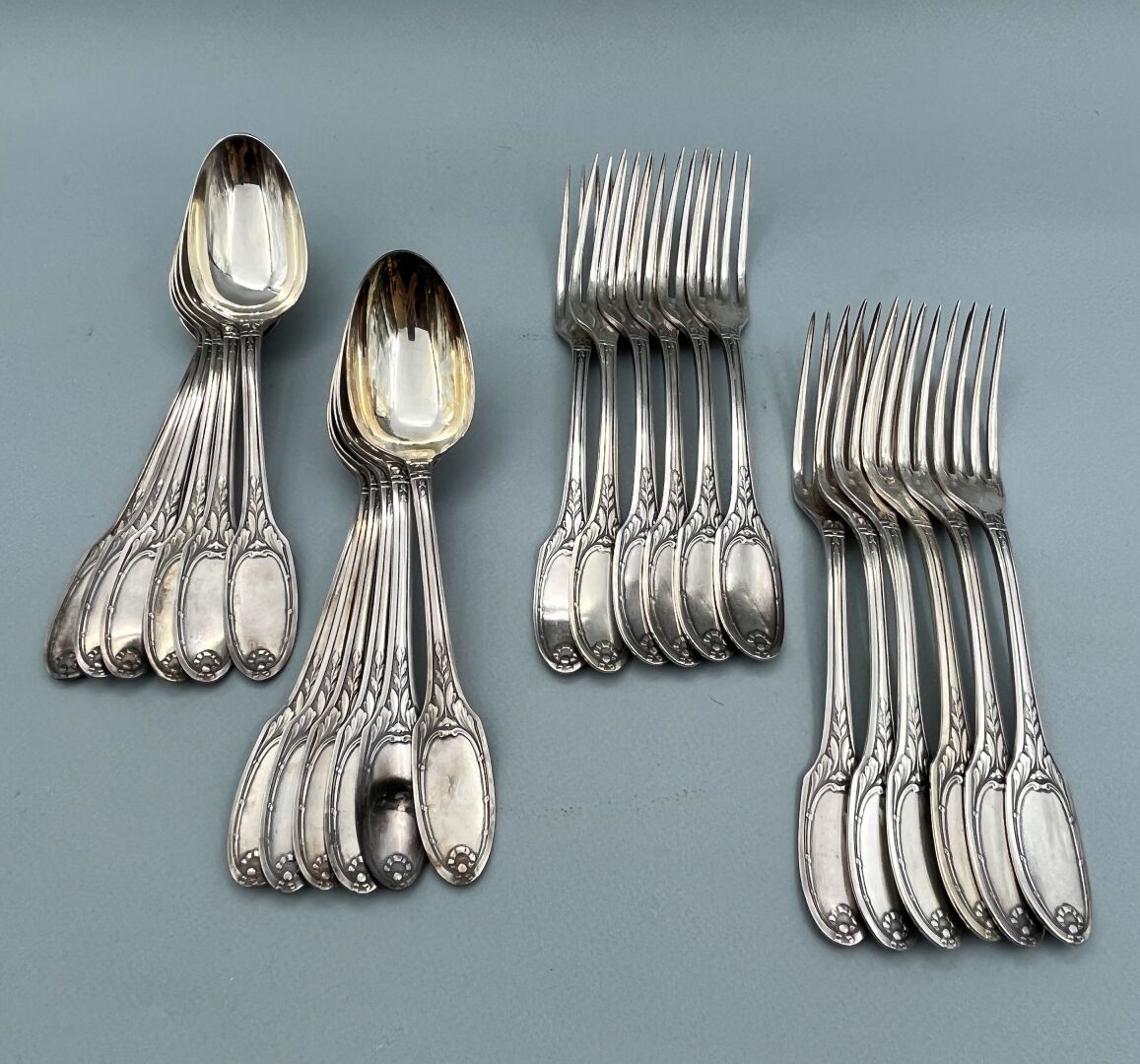 67 RÉSULTAT: 60 € ESTIMATION: 60 / 80 € CHRISTOFLE – Suite de douze couverts de table en métal argenté à décor de cartouches, rubans et lauriers