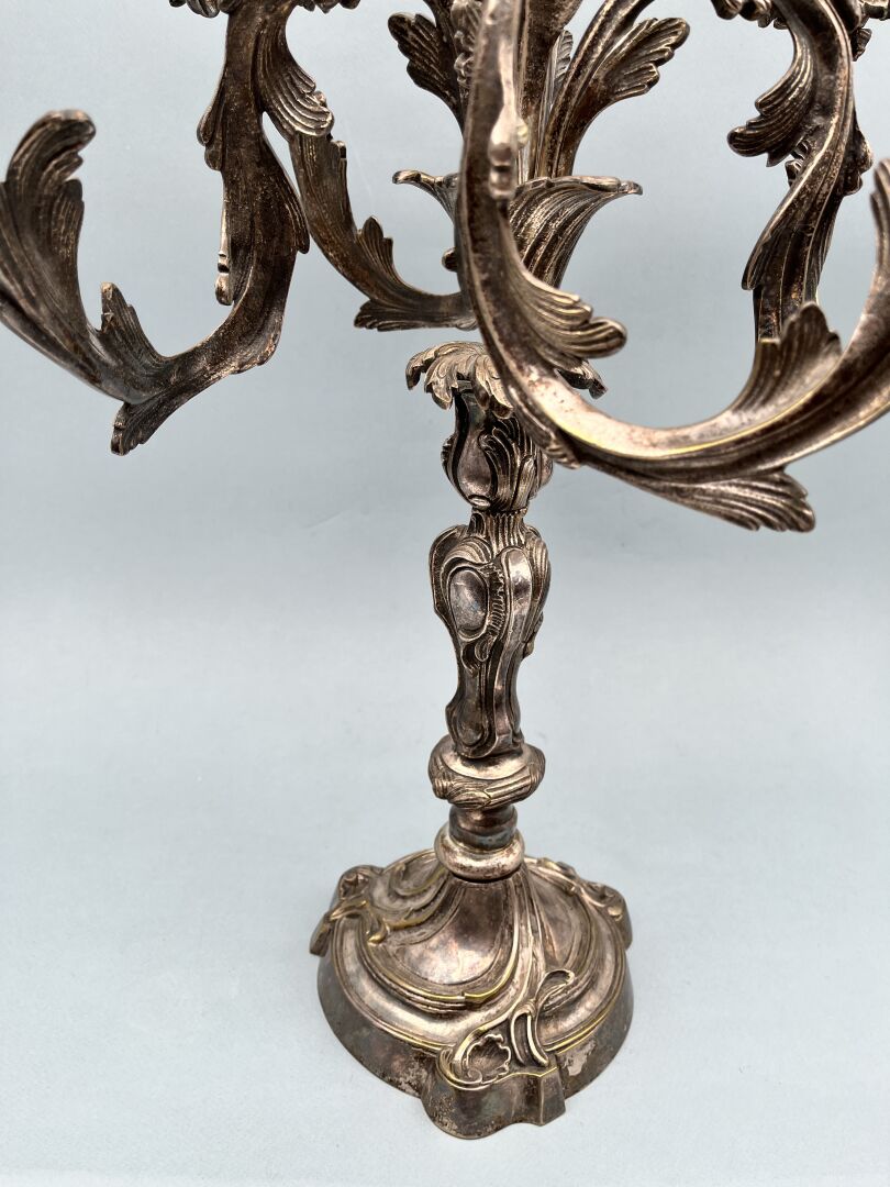 9 RÉSULTAT: 80 € ESTIMATION: 200 / 300 € Important candélabre en bronze argenté à cinq lumières, riche ornementation de volutes et feuillages, Travail de style Louis XV H : 58 cm