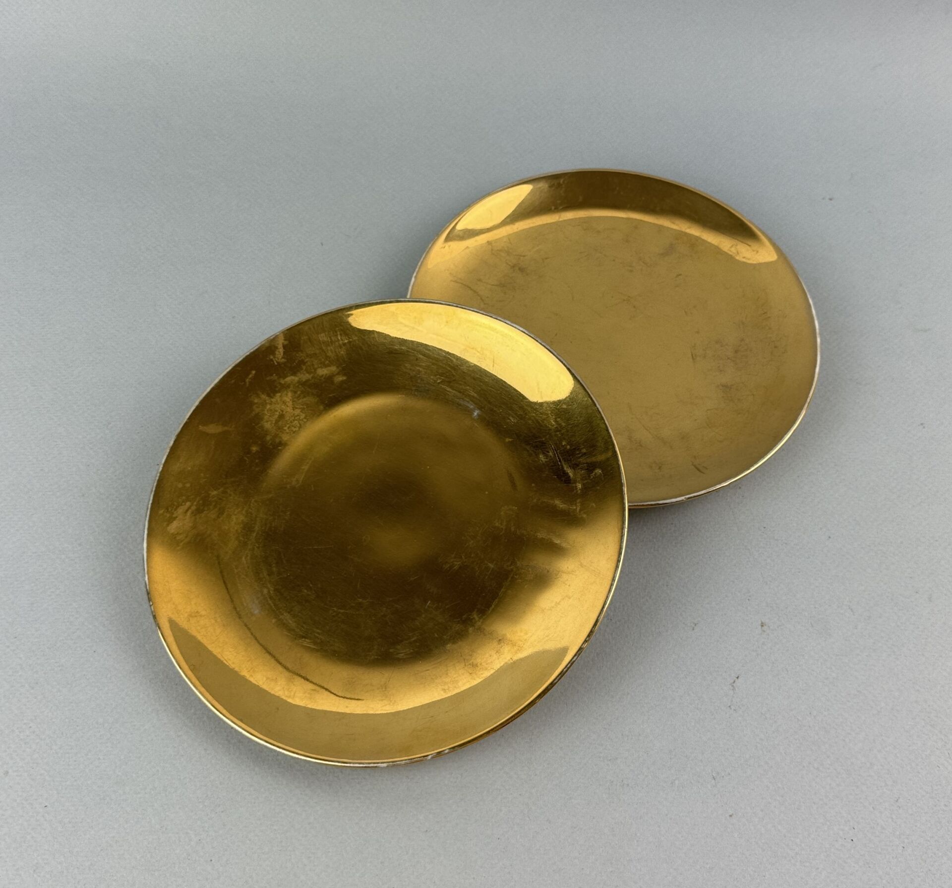 Deux assiettes à dessert en porcelaine blanche lustré doré